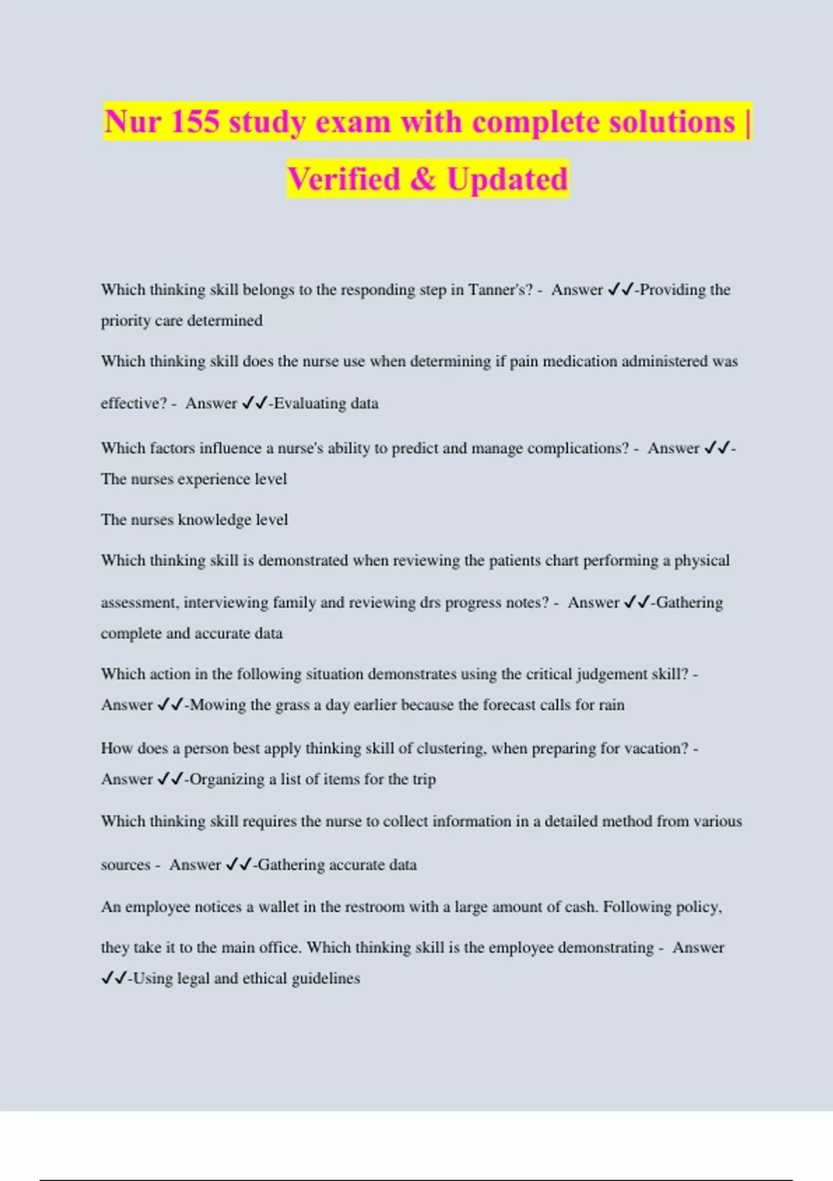 Nur 155 study exam with complete solutions | Verified & Updated Which thinking skill belongs to the responding step in Tanner's? - Answer ️️ -Providing the priority care determined Which thinking skill does the nurse use when determining if pain medication administered was effective? - Answer ️️ -Evaluating data Which factors influence a nurse's ability to predict and manage complications? - Answer ️️ - The nurses experience level The nurses knowledge level Which thinking skill is demonstrated when reviewing the patients chart performing a physical assessment, interviewing family and reviewing drs progress notes? - Answer ️️ -Gathering complete and accurate data Which action in the following situation demonstrates using the critical judgement skill? - Answer ️️ -Mowing the grass a day earlier because the forecast calls for rain How does a person best apply thinking skill of clustering, when preparing for vacation? - Answer ️️ -Organizing a list of items for the trip Which thinking skill requires the nurse to collect information in a detailed method from various sources - Answer ️️ -Gathering accurate data An employee notices a wallet in the restroom with a large amount of cash. Following policy, they take it to the main office. Which thinking skill is the employee demonstrating - Answer ️️ -Using legal and ethical guidelines parent has been helping their two children with homework and determines that one is improving while the other is still doing poorly. Which thinking skill is the parent using in this situation? - Answer ️️ -Comparing and contrasting A nurse is caring for a 56 yr old patient diagnosed with hypertension. The nurse completes the Epworth sleepiness scale and the patient scores an 11. Which action will the nurse take? - Answer ️️ -Ask pt about their lifestyle Subject data - Answer ️️ -Pt complains Nursing assistant reports patient's urine drainage bag appears to be infected. How will the nurse determine accuracy and reliability of this information - Answer ️️ -Contact the physician, request an order for a urine culture 76 yr old from a long-term care facility is admitted with confusion and a large bump on their forehead. What action will the nurse take first? - Answer ️️ -Conduct a focused neuro assessment Which question will the nurse ask to best identify signs and symptoms? - Answer ️️ -What has changed Which thinking skill belongs to the interpreting step in Tanner's? - Answer ️️ -Comparing and contrasting Which thinking skill does the nurse use when grouping similar information to help identify a problem? - Answer ️️ -Clustering related info A Nurse is caring for elderly patient. The patient states he's been trying to lose weight over the past 3 months but he's gained 15 lbs. What is the nurse's next action - Answer ️️ -Conduct a patient interview and research the patient's chart to identify possible reasons for weight gain. Which step in Tanner's model of clinical judgement involves processing information understanding the situation and planning interventions? - Answer ️️ -Inte