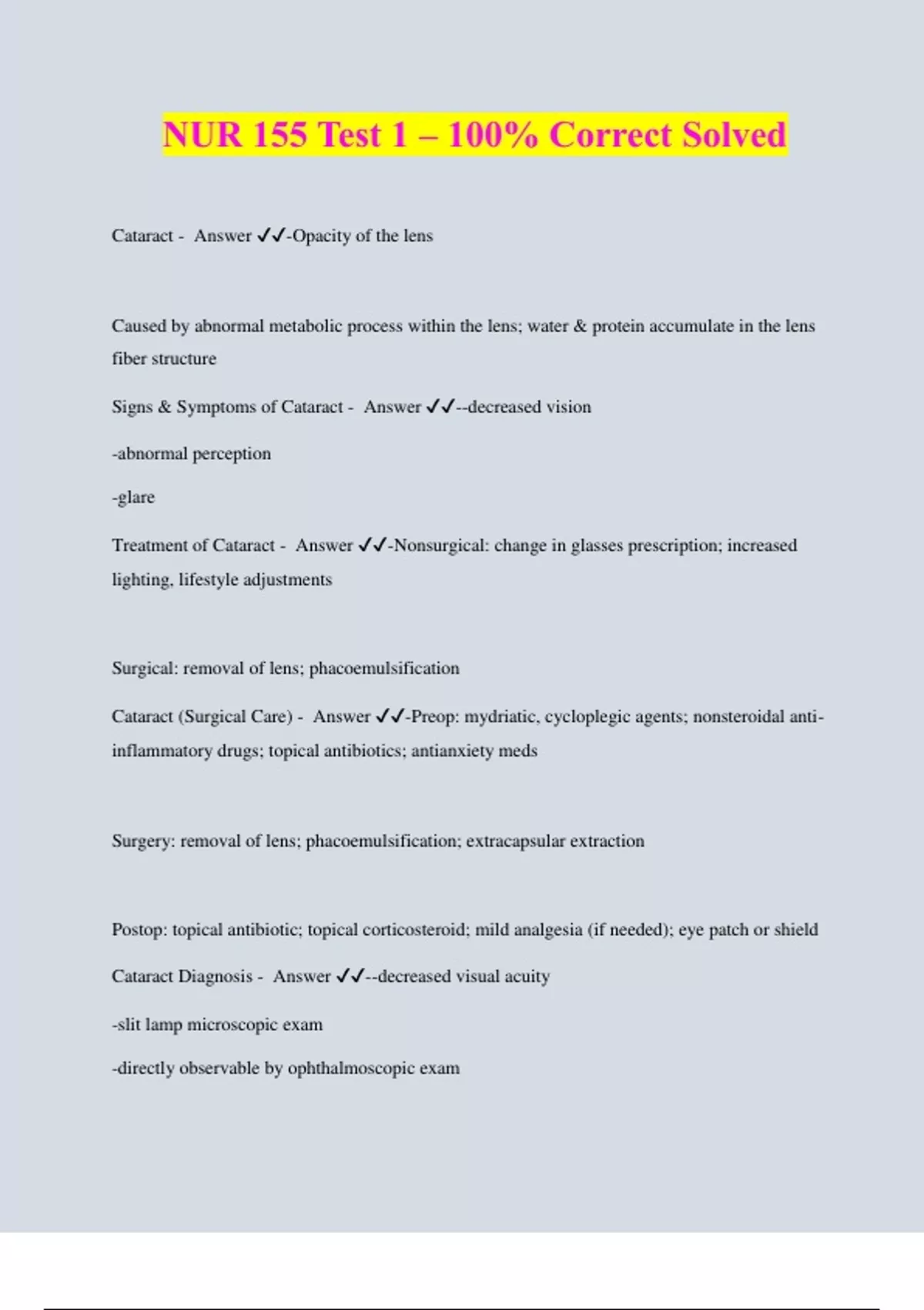 NUR 155 Test 1 – 100% Correct Solved Cataract - Answer ️️ -Opacity of the lens Caused by abnormal metabolic process within the lens; water & protein accumulate in the lens fiber structure Signs & Symptoms of Cataract - Answer ️️ --decreased vision -abnormal perception -glare Treatment of Cataract - Answer ️️ -Nonsurgical: change in glasses prescription; increased lighting, lifestyle adjustments Surgical: removal of lens; phacoemulsification Cataract (Surgical Care) - Answer ️️ -Preop: mydriatic, cycloplegic agents; nonsteroidal anti- inflammatory drugs; topical antibiotics; antianxiety meds Surgery: removal of lens; phacoemulsification; extracapsular extraction Postop: topical antibiotic; topical corticosteroid; mild analgesia (if needed); eye patch or shield Cataract Diagnosis - Answer ️️ --decreased visual acuity -slit lamp microscopic exam -directly observable by ophthalmoscopic exam What is the function of insulin? - Answer ️️ -regulates blood glucose level Somogyi Effect - Answer ️️ -hyperglycemia in the morning Glucose level should be checked between 2:00 - 4:00 am Another name for type 2 diabetes - Answer ️️ -Adult onset or non-insulin dependent Another name for type 1 diabetes - Answer ️️ -Juvenile diabetes insulin-dependent Type 1 Diabetes - Answer ️️ -autoimmune disorder in which the body develops antibodies against insulin/pancreatic B cells Primary defect in type 1 diabetes - Answer ️️ -autoimmune destruction of B cells of the pancreas Type 2 Diabetes - Answer ️️ -characterized by a combination of inadequate insulin secretion and insulin resistance What is the major difference in Type 1 and Type 2 diabetes? - Answer ️️ -presence of endogenous insulin Prediabetes - Answer ️️ -impaired glucose tolerance, impaired fasting glucose, or both Gestational Diabetes - Answer ️️ -occurs during pregnancy, around 25-28 weeks Symptoms of Type 1 Diabetes - Answer ️️ -Polyuria, Polydipsia, and Polyphagia. *onset is usually rapid Symptoms of Type 2 Diabetes - Answer ️️ -Often nonspecific, mostly the same as type 1 sympto