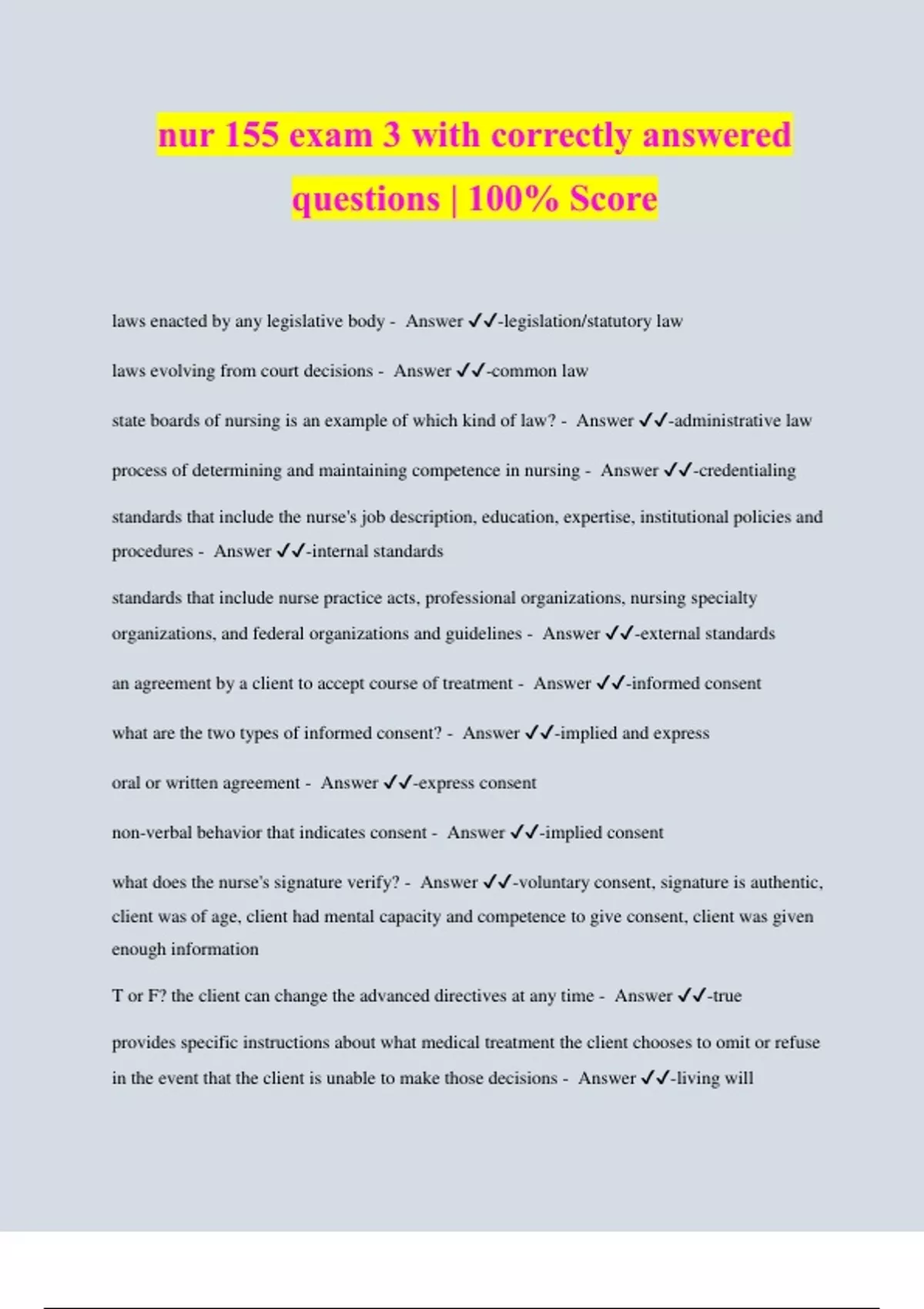 nur 155 exam 3 with correctly answered questions | 100% Score laws enacted by any legislative body - Answer ️️ -legislation/statutory law laws evolving from court decisions - Answer ️️ -common law state boards of nursing is an example of which kind of law? - Answer ️️ -administrative law process of determining and maintaining competence in nursing - Answer ️️ -credentialing standards that include the nurse's job description, education, expertise, institutional policies and procedures - Answer ️️ -internal standards standards that include nurse practice acts, professional organizations, nursing specialty organizations, and federal organizations and guidelines - Answer ️️ -external standards an agreement by a client to accept course of treatment - Answer ️️ -informed consent what are the two types of informed consent? - Answer ️️ -implied and express oral or written agreement - Answer ️️ -express consent non-verbal behavior that indicates consent - Answer ️️ -implied consent what does the nurse's signature verify? - Answer ️️ -voluntary consent, signature is authentic, client was of age, client had mental capacity and competence to give consent, client was given enough information T or F? the client can change the advanced directives at any time - Answer ️️ -true provides specific instructions about what medical treatment the client chooses to omit or refuse in the event that the client is unable to make those decisions - Answer ️️ -living will durable power of attorney for health care; notarized or witness statement appointing someone else to manage health care treatment when client is unable to do so - Answer ️️ -health care proxy post-mortem examination of the body - Answer ️️ -autopsy civil wrong doing - Answer ️️ -tort torts that do not require intent but require the element of harm - Answer ️️ -unintentional tort what are the 3 types of unintentional torts? - Answer ️️ -negligence, gross negligence, malpractice misconduct to practice below the standard expected of a person - Answer ️️ -negligence professional negligence - Answer ️️ -malpractice extreme lack of knowledge, skill, or decision making that the person clearly should have known would put others at risk for harm - Answer ️️ -gross negligence what are the types of intention torts? - Answer ️️ -assault/battery, false imprisonment, invasion of privacy, defamation protects health care providers providing assistance at an emergency scene against claims of malpractice - Answer ️️ -good samaritan act what should be included in an incident report? - Answer ️️ -date, time, place, description of facts, client's account of incident in quotes, any witnesses enduring beliefs or attitudes about the worth of a person, object, idea, or action - Answer ️️ - values opinions, interpretations, or conclusions that people accept as true - Answer ️️ -beliefs mental positions or feelings toward a person, idea, object - Answer ️️ -attitudes values are learned through ______ and ________- - Answer
