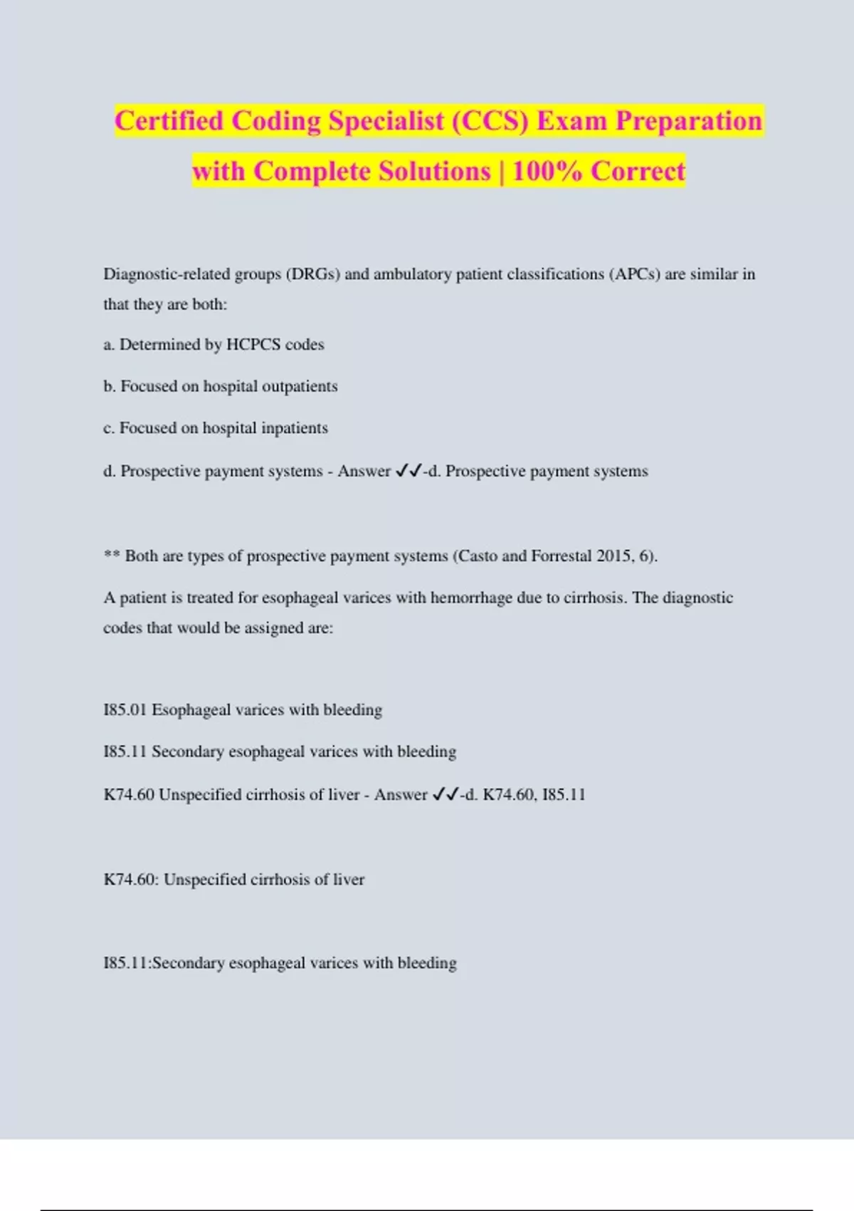 Certified Coding Specialist (CCS) Exam Preparation with Complete Solutions | 100% Correct Diagnostic-related groups (DRGs) and ambulatory patient classifications (APCs) are similar in that they are both: a. Determined by HCPCS codes b. Focused on hospital outpatients c. Focused on hospital inpatients d. Prospective payment systems - Answer ️️ -d. Prospective payment systems ** Both are types of prospective payment systems (Casto and Forrestal 2015, 6). A patient is treated for esophageal varices with hemorrhage due to cirrhosis. The diagnostic codes that would be assigned are: I85.01 Esophageal varices with bleeding I85.11 Secondary esophageal varices with bleeding K74.60 Unspecified cirrhosis of liver - Answer ️️ -d. K74.60, I85.11 K74.60: Unspecified cirrhosis of liver I85.11:Secondary esophageal varices with bleeding **The patient has cirrhosis of the liver with resulting bleeding esophageal varices. Cirrhosis of liver is sequenced first followed by the code for the bleeding esophageal varices (HHS 2017, Section I.A.13, 11). Assign the code(s) for bronchoscopy with bilateral transbronchial biopsy for each lobe of each lung. 31628 Bronchoscopy, rigid or flexible, including fluoroscopic guidance, when performed; with transbronchial lung biopsy(s), single lobe 31629 Bronchoscopy, rigid or flexible, including fluoroscopic guidance, when performed; with transbronchial needle aspiration biopsy(s), trachea, main stem and/or lobar bronchus(i) 31632 Bronchoscopy, rigid or flexible, including fluoroscopic guidance, when performed; with transbronchial lung biopsy(s), each additional lobe −50 Bilateral procedure - Answer ️️ - Assign the code(s) for endoscopic sinusotomy with bilateral anterior ethmoidectomy. 31231 Nasal endoscopy, diagnostic, unilateral or bilateral (separate procedure) 31254 Nasal/sinus endoscopy, surgical; with ethmoidectomy, partial (anterior) −50 Bilateral procedurea. a. 31254 b. 31254-50 c. 31254, 31254 d. 31231 - Answer ️️ -b. 31254-50 31254 Nasal/sinus endoscopy, surgical; with ethmoidectomy, partial (anterior) −50 Bilateral procedurea. ** A code for the anterior ethmoidectomy is assigned and to denote the bilateral procedure, a modifier of -50 is added (CPT Assistant Winter 1993, 23; Jan. 1997, 4; Sept. 1997, 10; Oct. 1997, 5; Dec. 2001, 6; May 2003, 5). The sinusotomy is not coded separately, as it is a diagnostic procedure. The most common language used for both data definition language and data manipulation language is: a. Unified modeling language b. JAVA c. Perl d. Structured query language - Answer ️️ -d. Structured query language ** Structured query language (SQL) is used commonly for data language and data definitions (Sharp 2016, 184). An ethmoidectomy removes infected tissue and bone in the ethmoid sinuses that blocks natural drainage. The surgeon views your ethmoid sinuses with an endoscope, a thin flexible tube with a very small camera and light at the end of it. - Answer ️️ - Documentation from the nursing or other allied health professionals' notes can be used to establish which of the following diagnoses: a. Body mass index (BMI) b. Malnutrition c. Aspiration pneumonia d. Fatigue - Answer ️️ -a. Body mass index
