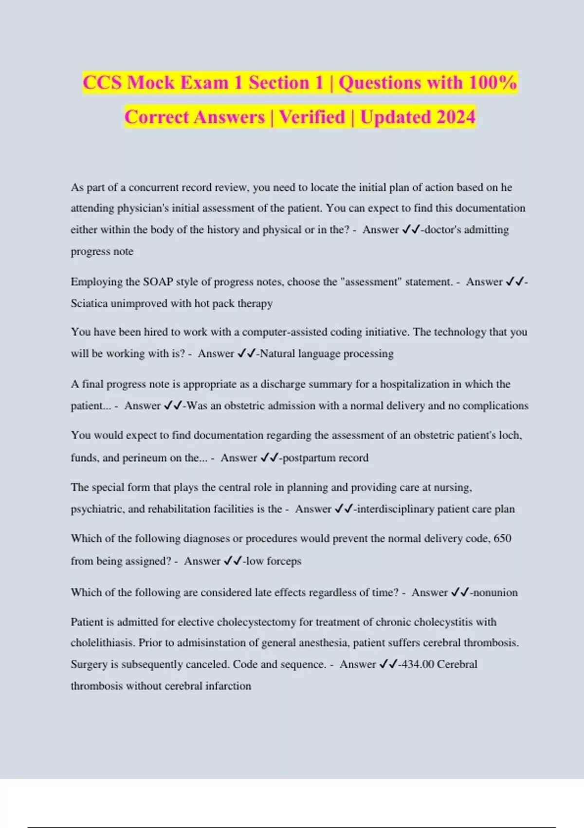 CCS Mock Exam 1 Section 1 | Questions with 100% Correct Answers | Verified | Updated 2024 As part of a concurrent record review, you need to locate the initial plan of action based on he attending physician's initial assessment of the patient. You can expect to find this documentation either within the body of the history and physical or in the? - Answer ️️ -doctor's admitting progress note Employing the SOAP style of progress notes, choose the "assessment" statement. - Answer ️️ - Sciatica unimproved with hot pack therapy You have been hired to work with a computer-assisted coding initiative. The technology that you will be working with is? - Answer ️️ -Natural language processing A final progress note is appropriate as a discharge summary for a hospitalization in which the patient... - Answer ️️ -Was an obstetric admission with a normal delivery and no complications You would expect to find documentation regarding the assessment of an obstetric patient's loch, funds, and perineum on the... - Answer ️️ -postpartum record The special form that plays the central role in planning and providing care at nursing, psychiatric, and rehabilitation facilities is the - Answer ️️ -interdisciplinary patient care plan Which of the following diagnoses or procedures would prevent the normal delivery code, 650 from being assigned? - Answer ️️ -low forceps Which of the following are considered late effects regardless of time? - Answer ️️ -nonunion Patient is admitted for elective cholecystectomy for treatment of chronic cholecystitis with cholelithiasis. Prior to admisinstation of general anesthesia, patient suffers cerebral thrombosis. Surgery is subsequently canceled. Code and sequence. - Answer ️️ -434.00 Cerebral thrombosis without cerebral infarction V64.1 Some ICD-9-CM Codes are exempt from POA reporting because they... - Answer ️️ - Represent circumstances regarding the health care encounter or factors influencing health status that do not represent a current d