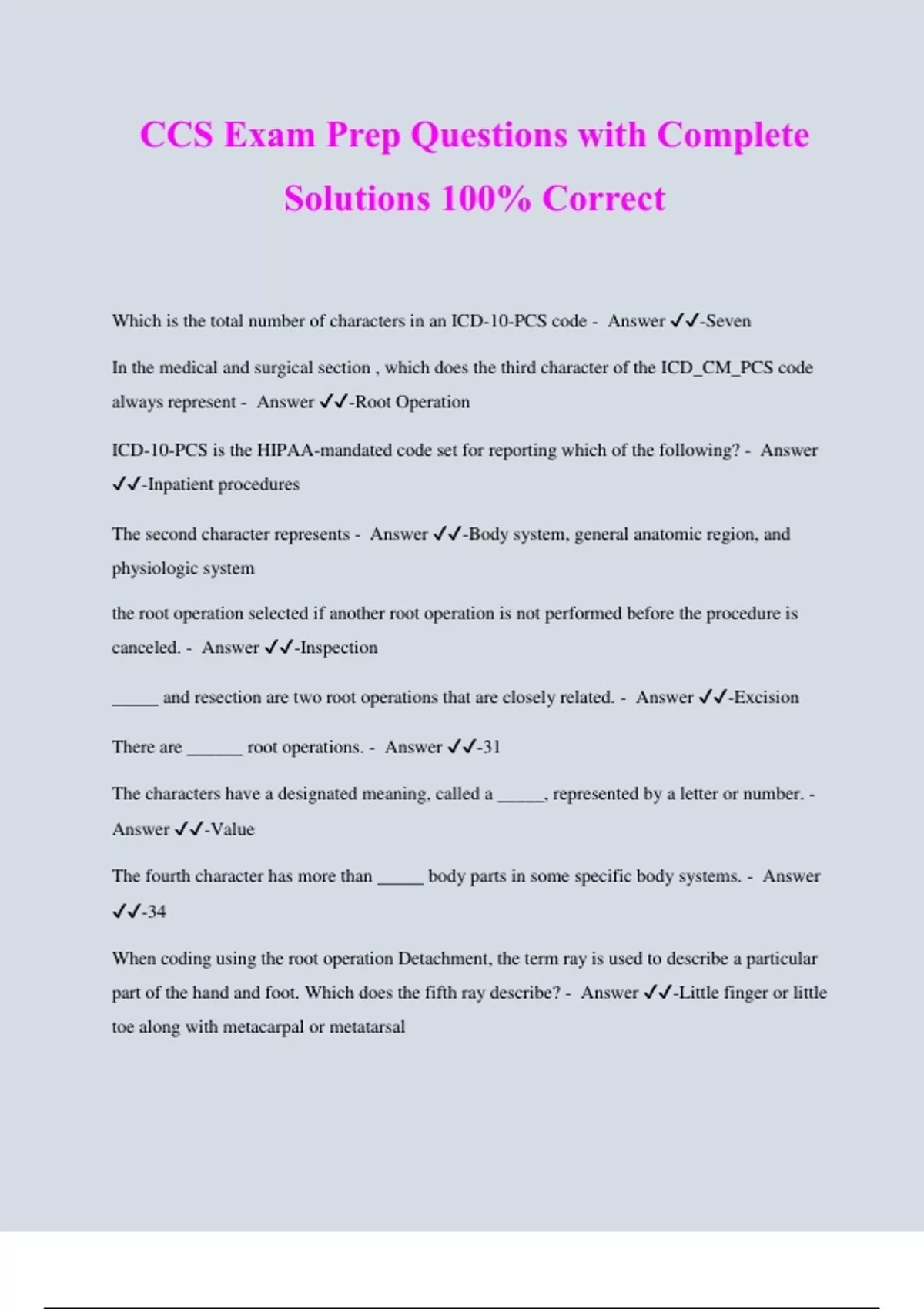CCS Exam Prep Questions with Complete Solutions 100% Correct Which is the total number of characters in an ICD-10-PCS code - Answer ️️ -Seven In the medical and surgical section , which does the third character of the ICD_CM_PCS code always represent - Answer ️️ -Root Operation ICD-10-PCS is the HIPAA-mandated code set for reporting which of the following? - Answer ️️ -Inpatient procedures The second character represents - Answer ️️ -Body system, general anatomic region, and physiologic system the root operation selected if another root operation is not performed before the procedure is canceled. - Answer ️️ -Inspection _____ and resection are two root operations that are closely related. - Answer ️️ -Excision There are ______ root operations. - Answer ️️ -31 The characters have a designated meaning, called a _____, represented by a letter or number. - Answer ️️ -Value The fourth character has more than _____ body parts in some specific body systems. - Answer ️️ -34 When coding using the root operation Detachment, the term ray is used to describe a particular part of the hand and foot. Which does the fifth ray describe? - Answer ️️ -Little finger or little toe along with metacarpal or metatarsal The inspection of a body part is considered integral to the procedure that is performed and the root operation. Inspection is not coded separately when - Answer ️️ -the inspection is solely the method used to get to the operative site to perform the procedure. 30-year-old patient has a herniorrhaphy without the use of mesh. Which is the root operation - Answer ️️ -Repair The physician documented that the patient had a "Biopsy of a right breast lesion." Which root operation is used? - Answer ️️ -Excision If the physician documents that the patient had a cornea transplant from a cadaver donor, which root operation is used? - Answer ️️ -Replacement The patient was treated for a wart on the thumb of his left hand. The physician performed cryotherapy of one wart on the thumb on the left hand. Which root operation is used to describe this procedure? - Answer ️️ -Destruction The root operation for a free skin graft is _____, but the root operation for a pedicled skin graft is _____. - Answer ️️ -Replacement, transfer Which root operation is used when a foreign body is removed from a body part? - Answer ️️ - Extirpation Which root operation describes procedures performed solely for cosmetic reasons? - Answer ️️ -Alteration Which is the root operation that can only have an external approach? - Answer ️️ -Change The root operation "Control" specifically involves stopping or attempting to stop _____ bleeding. - Answer ️️ -postprocedural or other acute All _____ characters must contain valid values to be valid procedure code. - Answer ️️ -Seven _____ procedures always include a device that reinforces a body part without replacing it. - Answer ️️ -Supplement