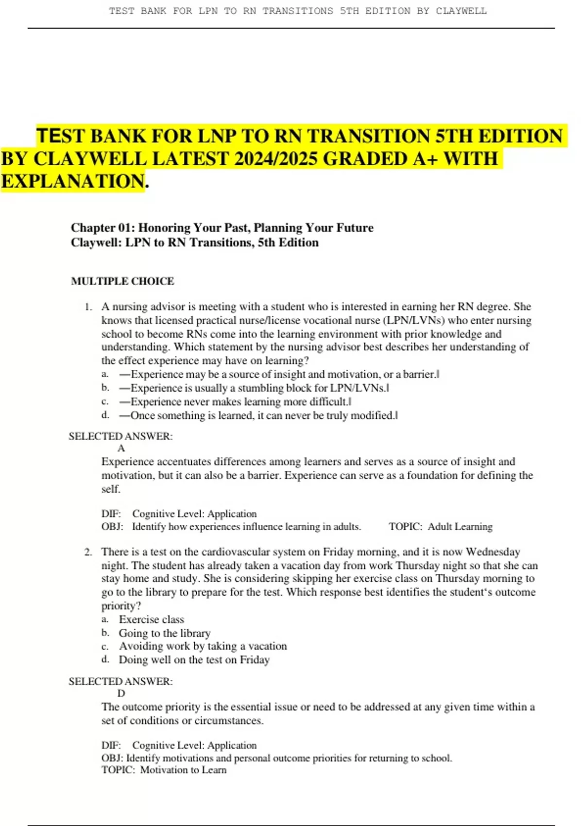 TEST BANK FOR LNP TO RN TRANSITION 5TH EDITION BY CLAYWELL LATEST 2024/2025 GRADED A+ WITH EXPLANATION. Chapter 01: Honoring Your Past, Planning Your Future Claywell: LPN to RN Transitions, 5th Edition MULTIPLE CHOICE 1. A nursing advisor is meeting with a student who is interested in earning her RN degree. She knows that licensed practical nurse/license vocational nurse (LPN/LVNs) who enter nursing school to become RNs come into the learning environment with prior knowledge and understanding. Which statement by the nursing advisor best describes her understanding of the effect experience may have on learning? a. ―Experience may be a source of insight and motivation, or a barrier.‖ b. ―Experience is usually a stumbling block for LPN/LVNs.‖ c. ―Experience never makes learning more difficult.‖ d. ―Once something is learned, it can never be truly modified.‖ SELECTED ANSWER: A Experience accentuates differences among learners and serves as a source of insight and motivation, but it can also be a barrier. Experience can serve as a foundation for defining the self. DIF: Cognitive Level: Application OBJ: Identify how experiences influence learning in adults. TOPIC: Adult Learning 2. There is a test on the cardiovascular system on Friday morning, and it is now Wednesday night. The student has already taken a vacation day from work Thursday night so that she can stay home and study. She is considering skipping her exercise class on Thursday morning to go to the library to prepare for the test. Which response best identifies the student‘s outcome priority? a. Exercise class b. Going to the library c. Avoiding work by taking a vacation d. Doing well on the test on Friday SELECTED ANSWER: D The outcome priority is the essential issue or need to be addressed at any given time within a set of conditions or circumstances. DIF: Cognitive Level: Application OBJ: Identify motivations and personal outcome priorities for returning to school. TOPIC: Motivation to Learn 3. A nurse who has been an LPN/LVN for 10 years is meeting with an advisor to discuss the possibility of taking classes to become an RN. The advisor interprets which statement by the nurse as the driving force for returning to school?