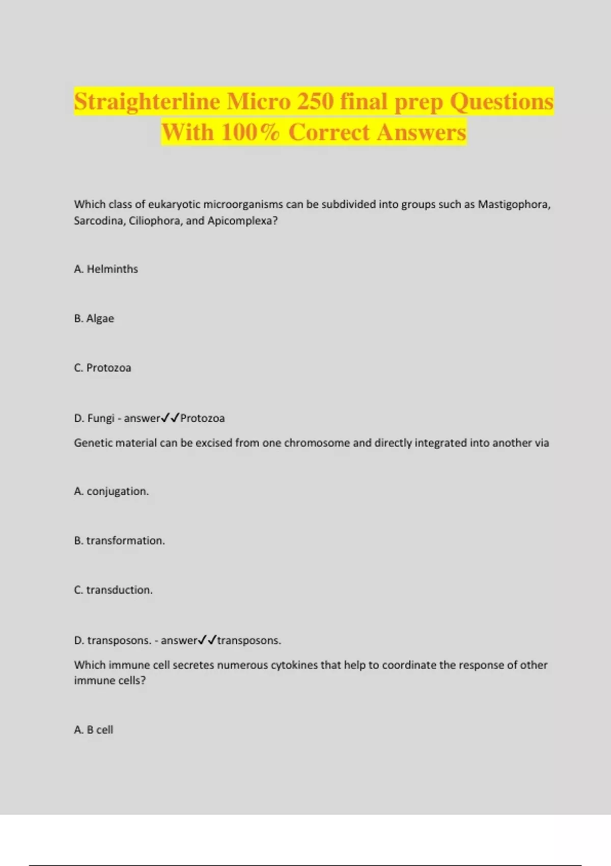 Straighterline Micro 250 final prep Questions With 100% Correct Answers Which class of eukaryotic microorganisms can be subdivided into groups such as Mastigophora, Sarcodina, Ciliophora, and Apicomplexa? A. Helminths B. Algae C. Protozoa D. Fungi - answerProtozoa Genetic material can be excised from one chromosome and directly integrated into another via A. conjugation. B. transformation. C. transduction. D. transposons. - answertransposons. Which immune cell secretes numerous cytokines that help to coordinate the response of other immune cells? A. B cell B. TH cell C. TC cell D. Platelets - answerTH cell Which of the following enzymes are used to amplify DNA during PCR? A. restriction endonuclease B. DNA polymerase C. reverse transcriptase D. DNA ligase - answerDNA polymerase In the nitrogen cycle, which of the following steps involves removal of nitrogen from the atmosphere by bacteria? - answernitrogen fixation, In nitrogen fixation, nitrogen is removed from the atmosphere by nitrogen-fixing bacteria and converted to ammonia. If enough h+ ions are added to pure water to raise the H+ concentration of the solution to ten times higher than the original concentration, what is the resulting OH- concentration of the solution? - answer10 -8M Fungi are able to reproduce asexually by creating conidiospores and sporangiospores. Which of the following is an accurate explanation for why it is advantageous that they are also capable of sexual reproduction? Select one: a. Asexually produced offspring are more likely to compete for resources and will kill off the parental fungi. b. Fungi normally produce sexually but produce asexually in harsh conditions such as severe drought. c. Offspring from two parents may have variations in form and function that contribute to survival of the species. d. Sexual reproduction produces more offspring at a faster rate than spore formation. - answerOffspring from two parents may have variations in form and function that contribute to survival of the species. In a laboratory bacterial cell culture that has been infected by a virus, plaques are areas in which Select one: a. bacterial cells are resistant to the virus and have not been infected. b. there is no nutrient available for the bacteria to grow. c. the virus has spread and left behind the remains of dead cells. d. the virus has not yet spread to that area of cells. - answerthe virus has spread and left behind the remains of dead cells. The sun's energy is delivered as discrete packets that travel as waves and are called Select one: a. ATP. b. carotenoids. c. NADP. d. photons. - answerphotons. Which of the following is a characteristic of aerobic respiration? Select one: a. Oxygen-containing ions act as the final electron acceptors in electron transport. b. The process includes glycolysis, the Krebs cycle, and the electron transport chain. c. Aerobic respiration produces a total of 2 ATP molecules. d. Aerobic respiration produces lactic acid. - answerThe three stages of aerobic respiration are glycolysis, the Krebs cycle, and the electron transport chain. n completing protein synthesis in a prokaryote, what basic message is carried by a specialized codon that has no corresponding tRNA? Select one: a. "Fold peptide chain." b. "Terminate here." c. "Add cofactor." d. "Clip starting amino acid." - answer"Terminate here." The specialized codon signals the end of protein synthesis; there is not RNA because it is only needed if the process is to continue. Microbial drug resistance can be caused by mutations or by introduction of new genes into a population. Which of the following can only be caused by the introduction of new genes into a population? Select one: a. a metabolic pathway in the bacterium is shut down b. binding sites for the drug are reduced in number or affinity to the drug c. new enzymes that inactivate the drug are synthesized d. uptake of the drug into the bacterium is diminished - answernew enzymes that inactivate the drug are synthesized. This can only occur if new genes are introduced into the population. Why do the hands, feet, and breasts have more lymphatic vessels for host defense than other areas of the human body? Select one: a. They have a high risk for infection due to frequent contact. b. They have a greater density of nerves. c. They require complex movement of fluids from the extremities. d. They are located a long distance from the thalamus. - answerThey have a high risk for infection due to frequent contact. Penicillin functions as an antimicrobial agent by inhibiting bacterial Select one: a. cell wall synthesis. b. folic acid synthesis. c. protein synthesis. d. RNA and DNA function. - answercell wall synthesis. Penicillin belongs to a class of antibacterial agents that interfere with the production of the material that makes up the bacterial cell wall. The bacteria must constantly replace this material or they will become susceptible to rupture due to osmotic pressure. If enough ions are added to pure water to raise the concentration of the solution to ten times higher than the original concentration, what is the resulting concentration of the solution? - answer The study of evolutionary relationships among organisms is called - answerphylogeny The three cell types discussed, eukaryotes, archaea, and bacteria, all derived from - answerLast Universal Com