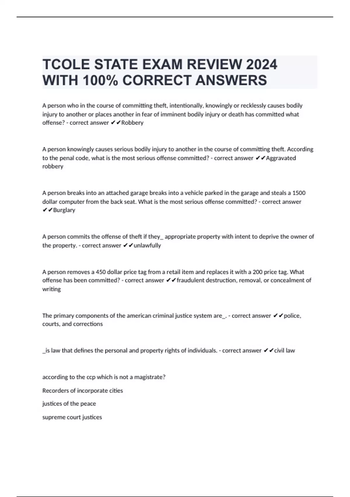 A person who in the course of committing theft, intentionally, knowingly or recklessly causes bodily injury to another or places another in fear of imminent bodily injury or death has committed what offense? - correct answer Robbery A person knowingly causes serious bodily injury to another in the course of committing theft. According to the penal code, what is the most serious offense committed? - correct answer Aggravated robbery A person breaks into an attached garage breaks into a vehicle parked in the garage and steals a 1500 dollar computer from the back seat. What is the most serious offense committed? - correct answer Burglary A person commits the offense of theft if they_ appropriate property with intent to deprive the owner of the property. - correct answer unlawfully A person removes a 450 dollar price tag from a retail item and replaces it with a 200 price tag. What offense has been committed? - correct answer fraudulent destruction, removal, or concealment of writing The primary components of the american criminal justice system are_. - correct answer police, courts, and corrections _is law that defines the personal and property rights of individuals. - correct answer civil law accordin