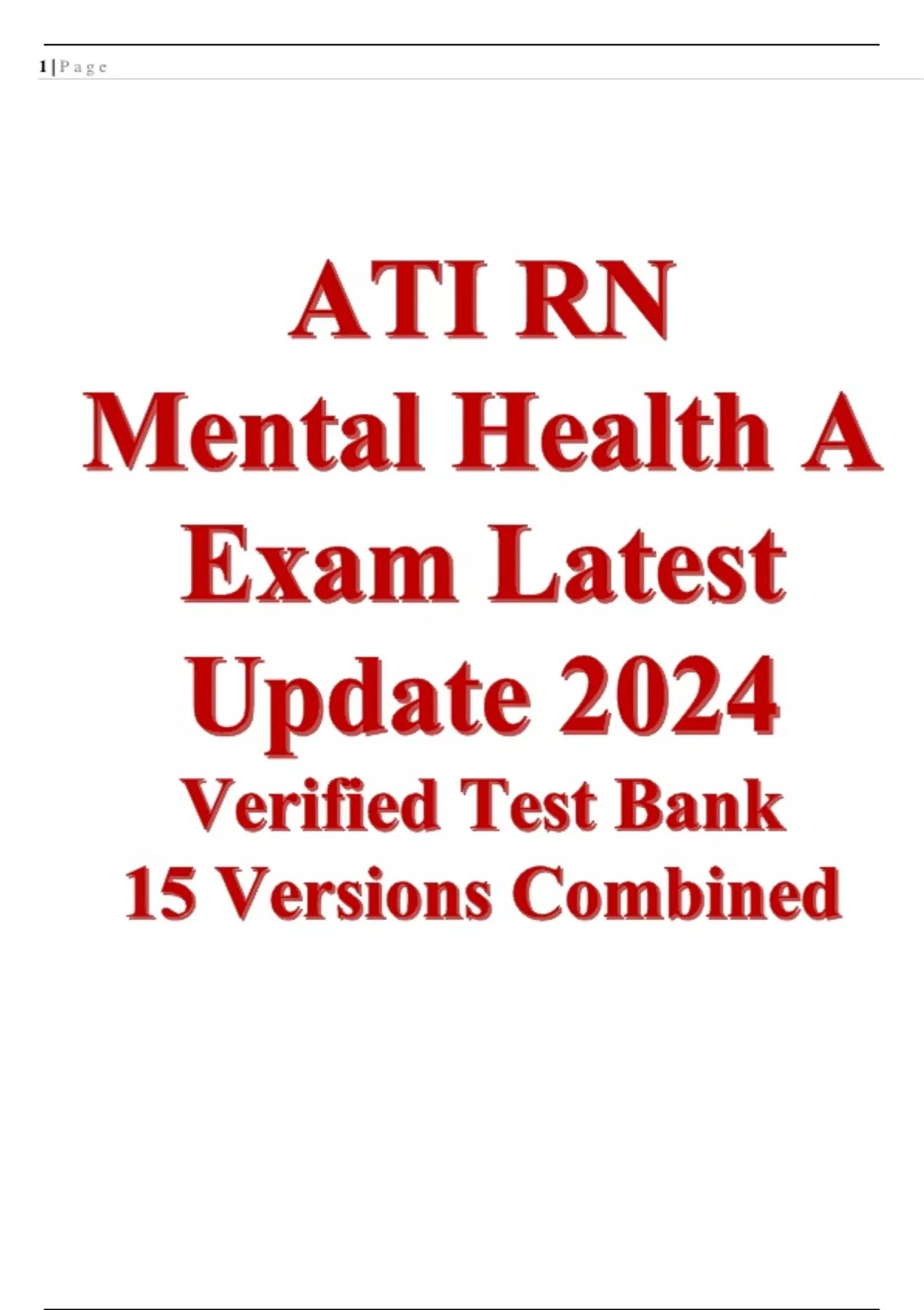 ATI RN Mental Health A Exam Latest Update 2024 Verified Test Bank 15 Versions Combined