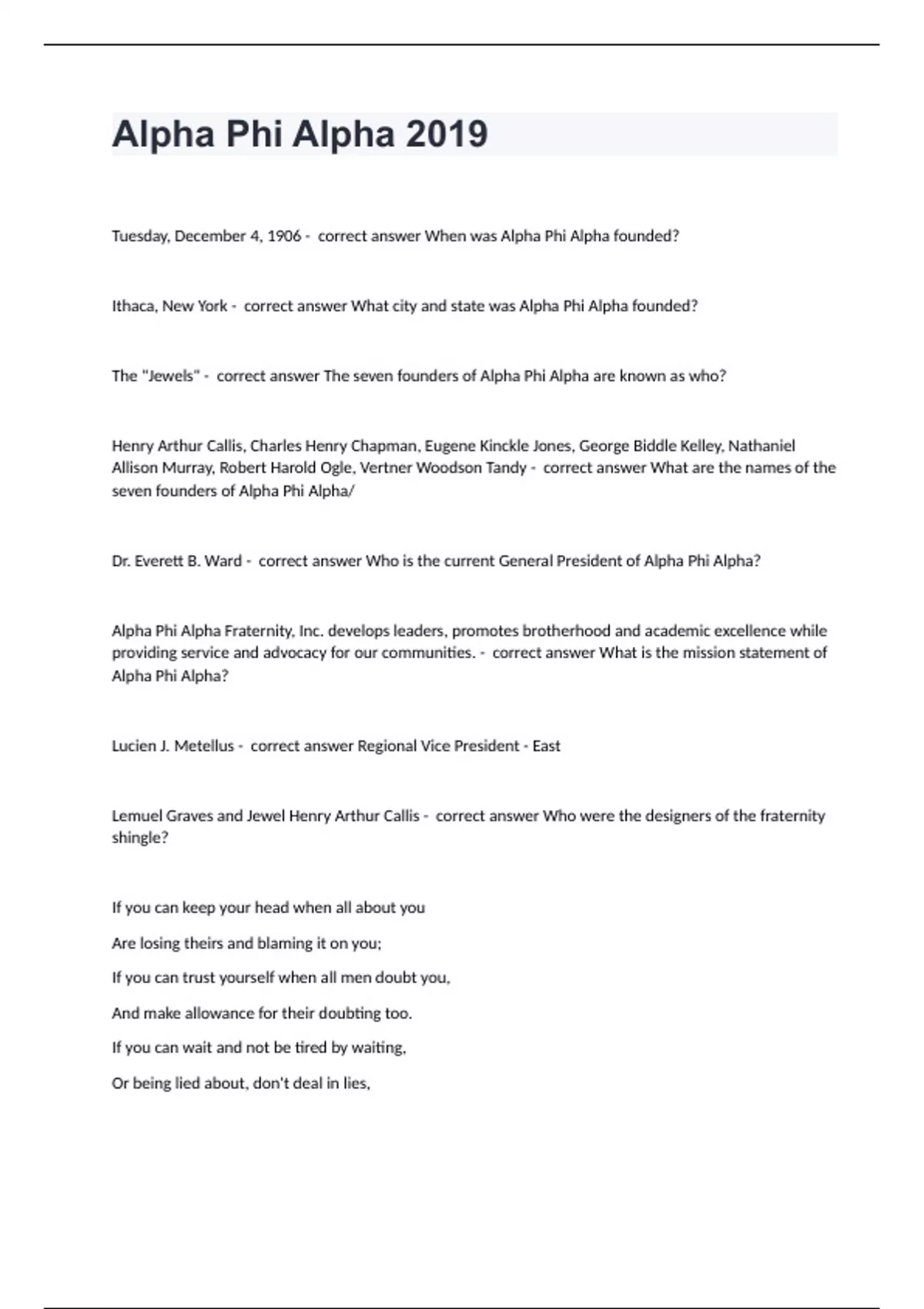 Alpha Phi Alpha 2019Tuesday, December 4, 1906 - correct answer When was Alpha Phi Alpha founded? Ithaca, New York - correct answer What city and state was Alpha Phi Alpha founded? The "Jewels" - correct answer The seven founders of Alpha Phi Alpha are known as who? Henry Arthur Callis, Charles Henry Chapman, Eugene Kinckle Jones, George Biddle Kelley, Nathaniel Allison Murray, Robert Harold Ogle, Vertner Woodson Tandy - correct answer What are the names of the seven founders of Alpha Phi Alpha/ Dr. Everett B. Ward - correct answer Who is the current General President of Alpha Phi Alpha? Alpha Phi Alpha Fraternity, Inc. develops leaders, promotes brotherhood and academic excellence while providing service and advocacy for our communities. - correct answer What is the mission statement of Alpha Phi Alpha? Lucien J. Metellus - correct answer Regional Vice President - East Lemuel Graves and Jewel Henry Arthur Callis - correct answer Who were the designers of the fraternity shingle? If you can keep your head when all about you Are losing theirs and blaming it on you; If you can trust yourself when all men doubt you, And make allowance for their doubting too. If you can wait and not be tired by waiting, Or being lied about, don't deal in lies,