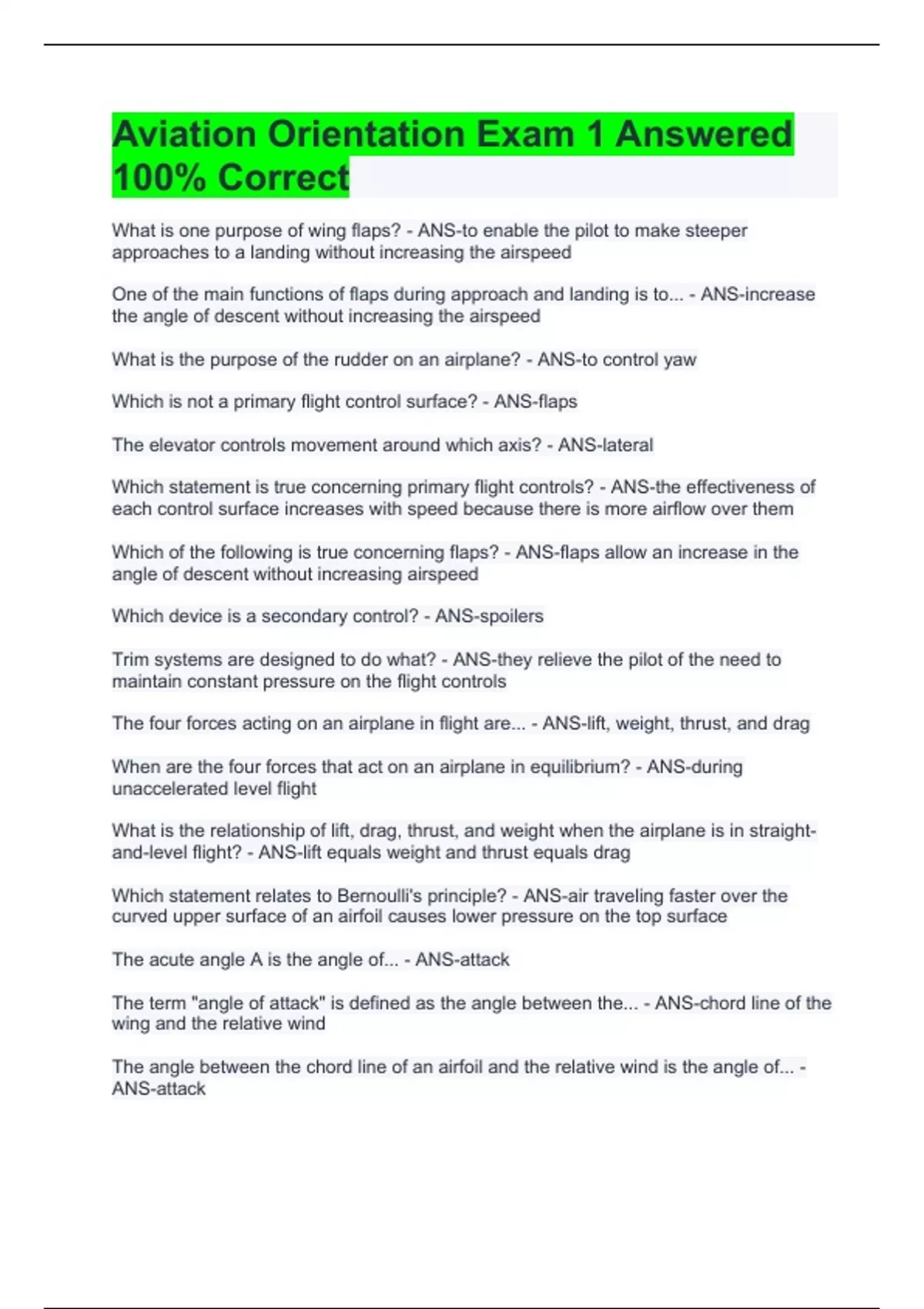 aviation orientation exam 1 answered 100 correct
