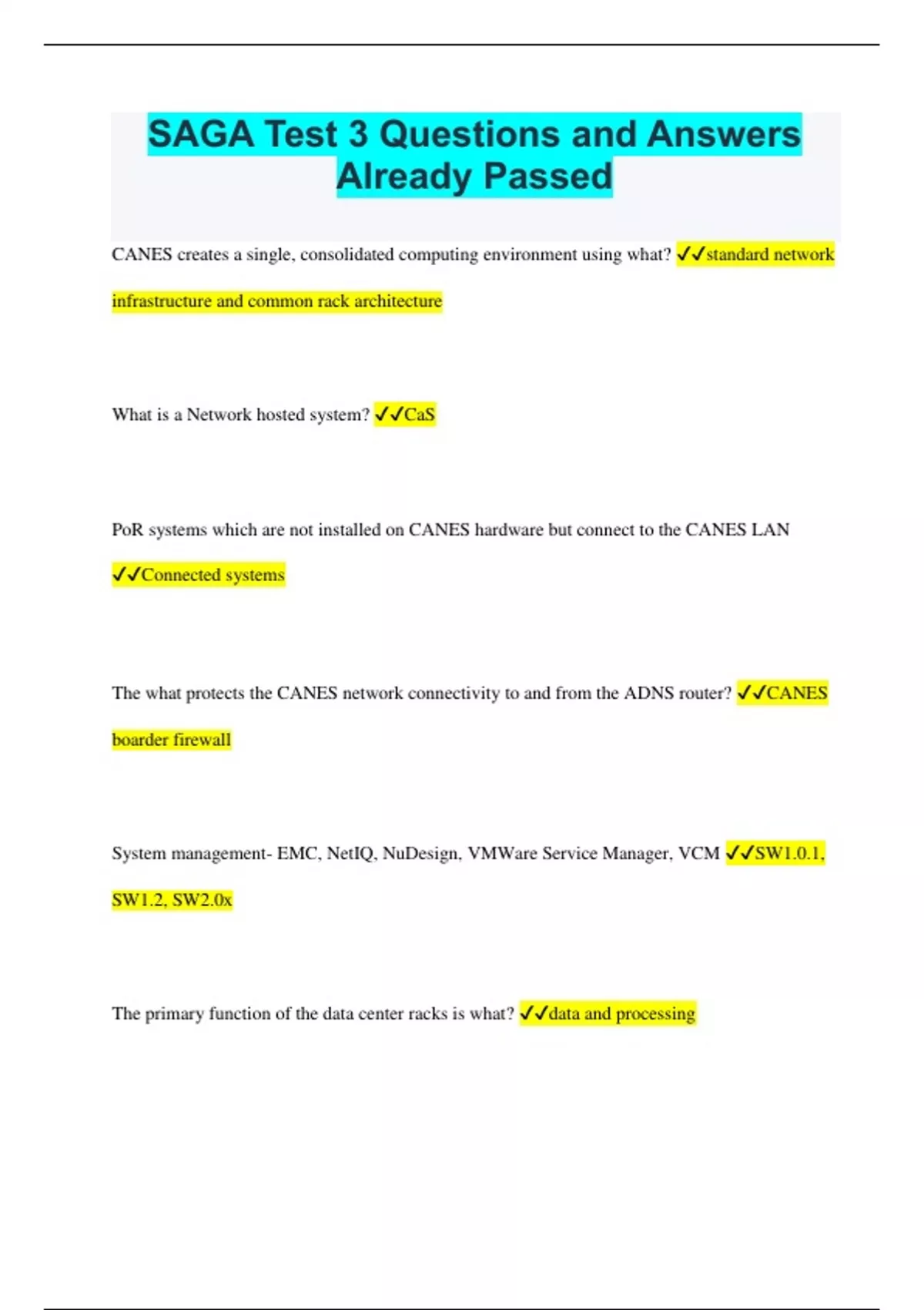 SAGA Test 3 Questions and Answers Already Passed CANES creates a single, consolidated computing environment using what? standard network infrastructure and common rack architecture What is a Network hosted system? CaS PoR systems which are not installed on CANES hardware but connect to the CANES LAN Connected systems The what protects the CANES network connectivity to and from the ADNS router? CANES boarder firewall System management- EMC, NetIQ, NuDesign, VMWare Service Manager, VCM SW1.0.1, SW1.2, SW2.0x The primary function of the data center racks is what? data and processing What provides the ability for users to access multiple security enclaves from the same client workstation? The Cross-Domain Access Server (CAS) The IA domain ensures what? the proper identification, authentication, and authorization of systems and users within the CANES enterprise What is a privileged-user account that will be granted membership in the security groups needed to execute the Tier 0 CANES _____ _____ role? Domain Administrator What is a privileged-user account that will be granted membership in the security groups needed to execute the Tier 2 CANES _____ _____ role which allows full administration of local workstations in the CANES Computers OU? Workstation Administrator _____ _______ ________ allowing the specification of a network device address by name rather than number. Domain Name Service (DNS) What version of COMPOSE incorporates Windows 2003 R2 Standard and Enterprise server, Windows XP Professional clients, and Windows Vista clients? 3.5 File Servers FS01-FS03 What does the total number of file servers in your system depend on? type of configuration What is the main purpose of DCM? to identify each of the server roles and their functionality within a COMPOSE domain environment Where is the COMPOSE tools folder icon located