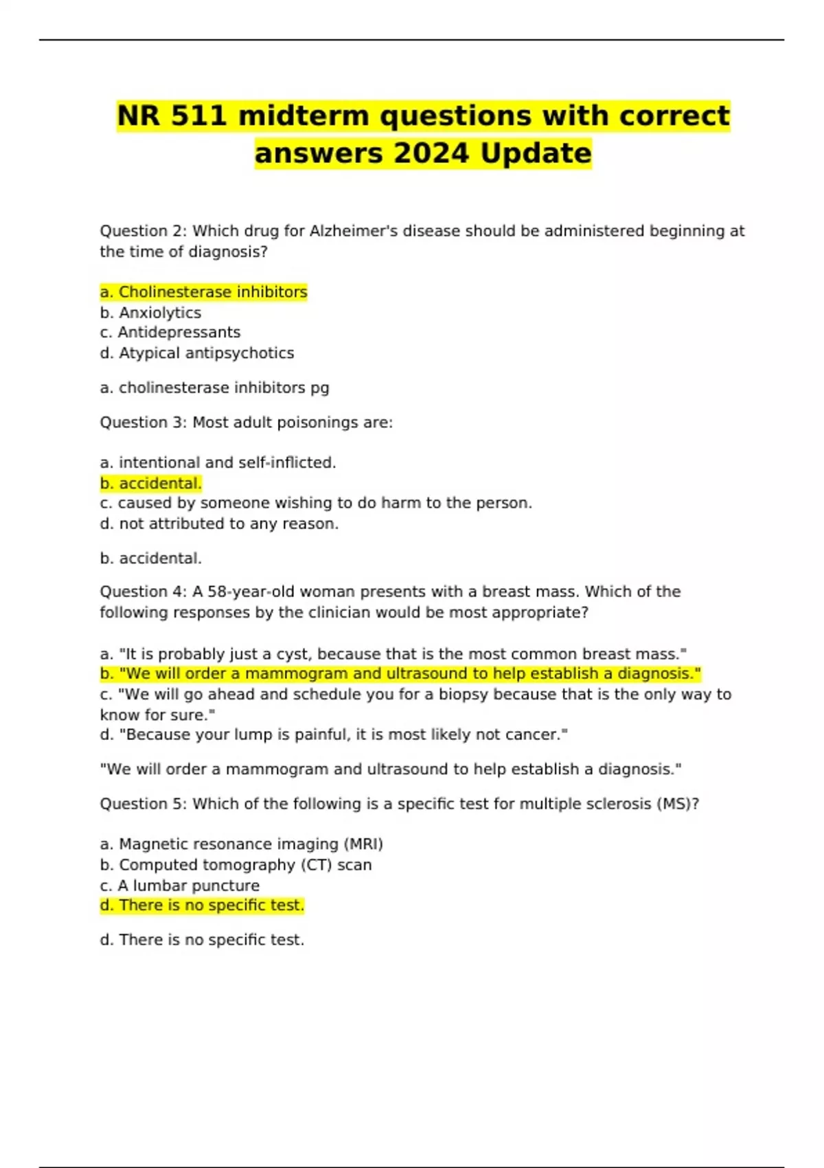 NR 511 midterm questions with correct answers 2024 Update NR 511 midterm questions with correct answers 2024 Update Question 2: Which drug for Alzheimer's disease should be administered beginning at the time of diagnosis? a. Cholinesterase inhibitors b. Anxiolytics c. Antidepressants d. Atypical antipsychotics a. cholinesterase inhibitors pg Question 3: Most adult poisonings are: a. intentional and self-inflicted. b. accidental. c. caused by someone wishing to do harm to the person. d. not attributed to any reason. b. accidental. Question 4: A 58-year-old woman presents with a breast mass. Which of the following responses by the clinician would be most appropriate? a. "It is probably just a cyst, because that is the most common breast mass." b. "We will order a mammogram and ultrasound to help establish a diagnosis." c. "We will go ahead and schedule you for a biopsy because that is the only way to know for sure." d. "Because your lump is painful, it is most likely not cancer." "We will order a mammogram and ultrasound to help establish a diagnosis." Question 5: Which of the following is a specific test for multiple sclerosis (MS)? a. Magnetic resonance imaging (MRI) b. Computed tomography (CT) scan c. A lumbar puncture d. There is no specific test. d. There is no specific test. Question 7: Which characteristic of delirium helps to distinguish delirium from dementia? a. Abrupt onset b. Impaired attention c. Affective changes d. Delusions Abrupt onset Question 8: Which clinical feature is the first to be affected in increased intracranial pressure (ICP)? a. Decrease in level of consciousness (LOC) b. Headache c. Nausea d. Widening pulse pressure Decrease in level of consciousness (LOC) Question 9: Jennifer is an 18-year-old girl who comes to the emergency room after a fall during a soccer game. Jennifer explains that she fell on her left side and kept her arm out straight to break her fall. She has been experiencing severe pain and limited range of motion in her left shoulder. The clinician has diagnosed Jennifer with a dislocated shoulder. Which of the following statements are true concerning shoulder dislocation? a. Posterior dislocations are more common than anterior dislocations. b. There is a risk of neurovascular and neurosensory trauma, so the clinician should check for distal pulses. c. Recurrent dislocations are uncommon and would require a greater force to result in injury. d. Surgery is most commonly the treatment of choice. There is a risk of neurovascular and neurosensory trauma, so the clinician should check for distal pulses. Question 10: Which of the following signs or symptoms indicate an inflammatory etiology to musculoskeletal pain? a. Decreased C-reactive protein b. Hyperalbuminemia c. Morning stiffness d. Weight gain morning stiffness Question 11: The clinician sees a patient who is 5 feet tall and weighs 150 pounds. How would the clinician classify this patient? a. Overweight b. Mild obesity c. Moderate obesity d. Morbid obesity Mild obesity Question 13: A 23-year-old sexually active woman presents for her first Pap smear. Her history includes nulligravida, age at first intercourse 14, and more than 10 sexual partners. Which of the following conditions should the clinician be particularly alert for during her exam? a. Human papillomavirus (HPV) b. Endometrial hyperplasia c. Vagismus d. Polycystic ovarian syndrome Human papillomavirus (HPV) Question 14: Which of the following classes of drugs should be used as first-line therapy for treatment of delirium? a. Benzodiazepines b. Antipsychotics c. Anticonvulsants d. Antidepressants Antipsychotic Question 15: What is the treatment of choice for a patient diagnosed with testicular cancer? a. Radical orchidectomy b. Lumpectomy c. Radiation implants d. All of the above treatment of choice for a patient diagnosed with testicular cancer? Radical orchidectomy Question 16: A 24-year-old woman presents to the clinic with dysuria, dyspareunia, and a mucopurulent vaginal discharge. Her boyfriend was recently treated for nongonococcal urethritis. What sexually transmitted disease (STD) has she most probably been exposed to? a. Gonorrhea b. Human papillomavirus (HPV) c. Chlamydia d. Trichomonas Chlamydia Question 17: A 58-year-old woman who had a total abdominal hysterectomy at the age of 45 is diagnosed with atrophic vaginitis. Which of the following is the most appropriate treatment? a. Conjugated estrogen 0.625 mg/day oral b. Estradiol 7.5 mcg/24 hr vaginal ring c. Medroxyprogesterone 10 mg/day oral d. Conjugated estrogen 0.3 mg + medroxyprogesterone 1.5 mg/day oral Estradiol 7.5 mcg/24 hr vaginal ring Question 18: When looking under the microscope to diagnose an intravaginal infection, you see a cluster of small and oval to round shapes. What do you suspect they are? a. Spores b. Leukocytes c. Pseudohyphae d. Epithelial cells spores Patients with a spontaneous pneumothorax should be counseled that up to what percentage may experience a reoccurrence at some point? a. 10% b. 20% c. 30% d. 50% 30% Question 20: John is a 16-year-old boy who presents to the emergency room after hurting his knee in a football game. He described twisting his knee and then being unable to extend it completely. John tells the clinician that he heard a pop when the injury occurred and has been experiencing localized pain. The clinician suspects a meniscal tear. Which test would be most appropriate to assess for the presence of a meniscal tear? a. Valgus stress test b. McMurray circumduction test c. Lachman test d. Varus stress test McMurray circumduction test Question 21: During a digital rectal exam (DRE) on a 75-year-old man, the clinician suspects the patient has prostate cancer. What physical finding should make the clinician suspicious? a. An enlarged rubbery gland b. A hard irregular gland c. A tender gland d. A boggy gland An enlarged rubbery gland Question 22: Janet is a 30-year-old woman who has been recently diagnosed with a herniated disc at the
