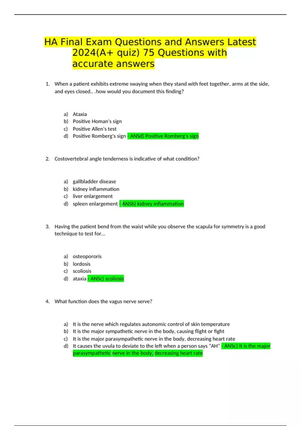 Health Assesment Final Exam Questions and Answers Latest 2024(A+ quiz) 75 Questions with accurate answersHA Final Exam Questions and Answers Latest 2024(A+ quiz) 75 Questions with accurate answers 1. When a patient exhibits extreme swaying when they stand with feet together, arms at the side, and eyes closed. how would you document this finding? a) Ataxia b) Positive Homan's sign c) Positive Allen's test d) Positive Romberg's sign - ANSd) Positive Romberg's sign 2. Costovertebral angle tenderness is indicative of what condition? a) gallbladder disease b) kidney inflammation c) liver enlargement d) spleen enlargement - ANSb) kidney inflammation 3. Having the patient bend from the waist while you observe the scapula for symmetry is a good technique to test for... a) osteopororis b) lordosis c) scoliosis d) ataxia - ANSc) scoliosis 4. What function does the vagus nerve serve? a) It is the nerve which regulates autonomic control of skin temperature b) It is the major sympathetic nerve in the body, causing flight or fight c) It is the major parasympathetic nerve in the body, decreasing heart rate d) It causes the uvula to deviate to the left when a person says "AH" - ANSc) It is the major parasympathetic nerve in the body, decreasing heart rate 5. What is involved in a functional assessment of an elderly client? a) ask the client's physician for information on the client's ability b) observe their ability to perform tasks c) review the medical records for information on the client's ability d) ask the wife about the client's ability to perform tasks - ANSb) observe their ability to perform tasks 6. What is the cause of a women wetting herself when sneezing? a) urge incontinence b) stress incontinence c) kidney stone d) urinary tract infection - ANSb) stress incontinence 7. Curd-like, white vaginal discharge with vaginal pruritis is indicative of what? a) herpes b) yeast c) syphillis d) gonorrhea - ANSb) yeast 8. The nurse knows resonance in the left lower lobe when percussing the client's posterior thorax is due to... a) normal lung tissue b) pneumothorax c) chronic bronchitis d) shallow breathing - ANSa) normal lung tissue 9. The following symptoms are indicative of what disease process? 10. -difficulty breathing 11. -sharp pain in left chest 12. -decreases tactile fremitus on left chest 13. -asymmetrical chest expansion 14. -tachypnea a) pneumonia b) bronchitis c) asthma d) pneumothorax - ANSd) pneumothorax 15. Which of the following clinical findings is suggestive of rheumatoid arthritis? a) heberden nodes b) swan-neck deformities c) dupuytren contractures d) bouchard nodes - ANSb) swan-neck deformities 16. What condition would cause tenting of the skin? a) scleroderma b) diabetes c) heart disease d) vomiting and diarrhea - ANSd) vomiting and diarrhea 17. A blood pressure of 144/94 is what stage of hypertension? a) stage 2 b) stage 3 c) stage 1 d) normal - ANSc) stage 1 18. A grade I murmur is .... a) heard best over the apex b) usually pathological c) easily noted with the bell of the stethoscope d) barely audible - ANSd) barely audible