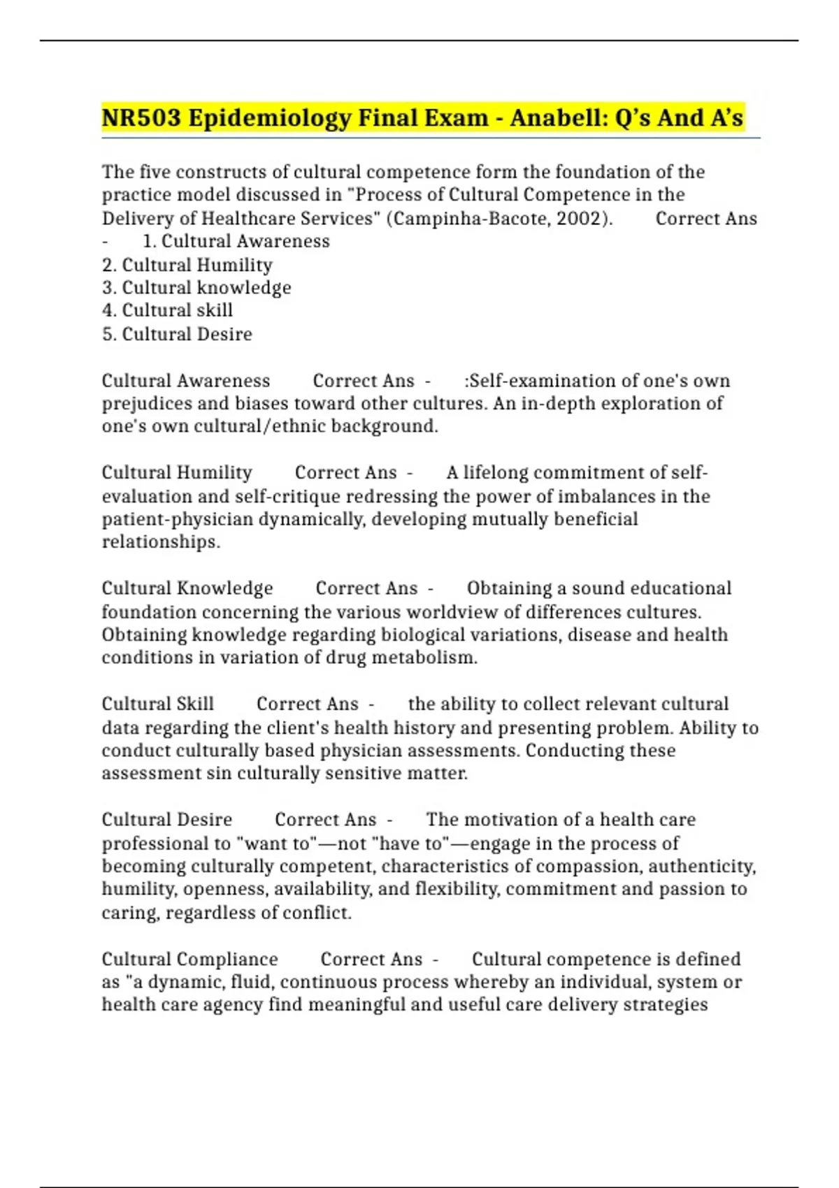 NR503 Epidemiology Final Exam - Anabell: Q’s And A’s
