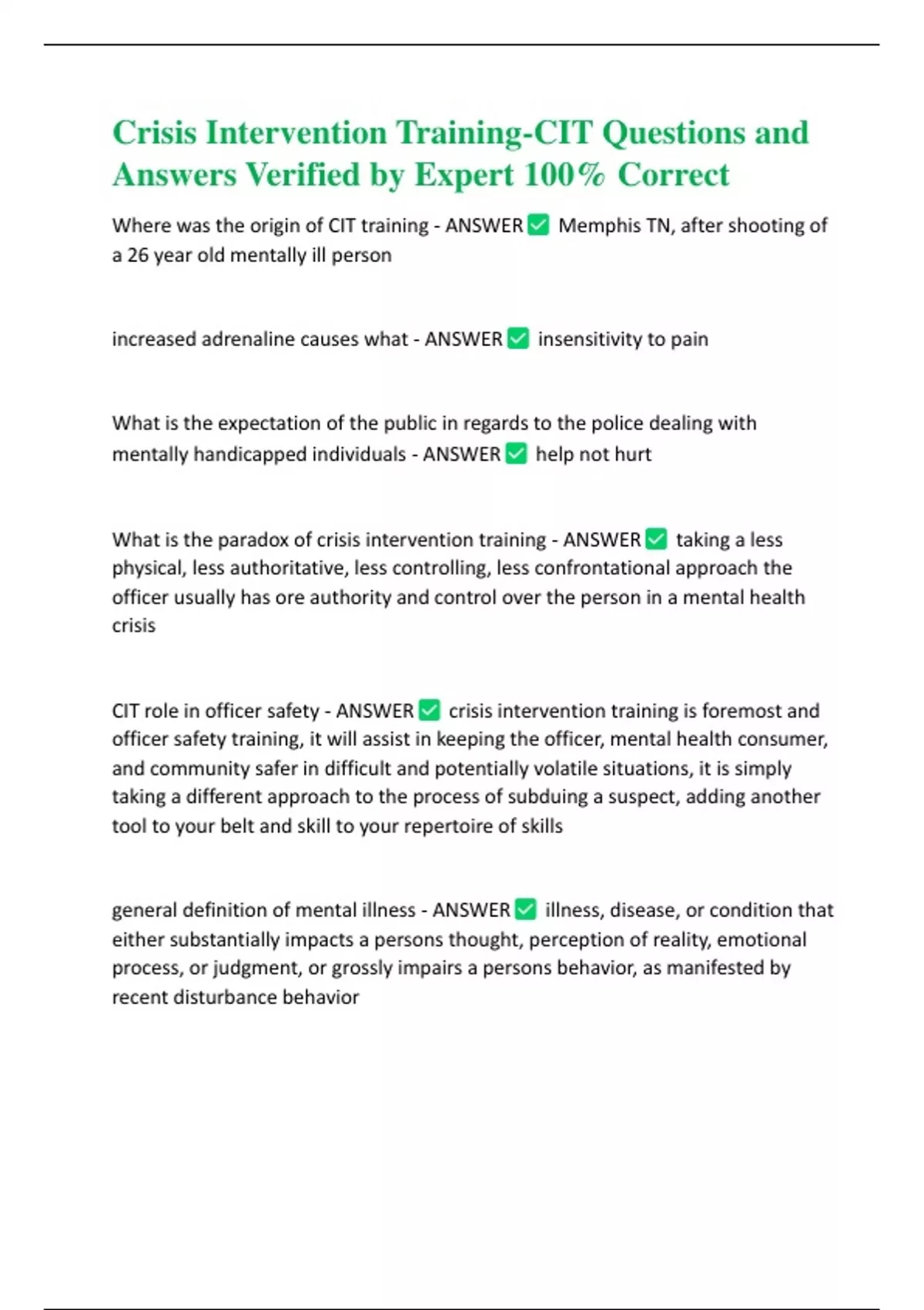Crisis Intervention Training-CIT Questions and Answers Verified by Expert 100% Correct