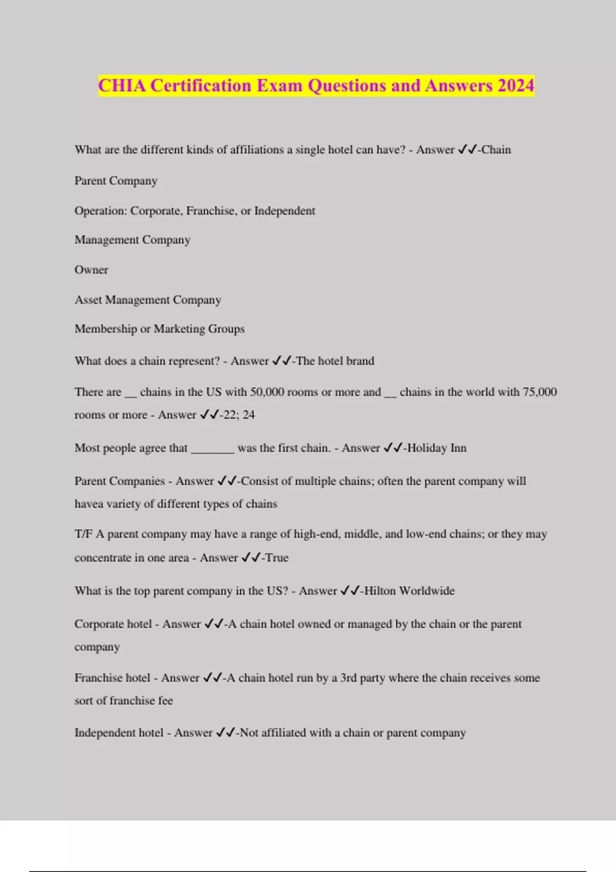 CHIA Certification Exam Questions and Answers 2024 What are the different kinds of affiliations a single hotel can have? - Answer ️️ -Chain Parent Company Operation: Corporate, Franchise, or Independent Management Company Owner Asset Management Company Membership or Marketing Groups What does a chain represent? - Answer ️️ -The hotel brand There are __ chains in the US with 50,000 rooms or more and __ chains in the world with 75,000 rooms or more - Answer ️️ -22; 24 Most people agree that _______ was the first chain. - Answer ️️ -Holiday Inn Parent Companies - Answer ️️ -Consist of multiple chains; often the parent company will havea variety of different types of chains T/F A parent company may have a range of high-end, middle, and low-end chains; or they may concentrate in one area - Answer ️️ -True What is the top parent company in the US? - Answer ️️ -Hilton Worldwide Corporate hotel - Answer ️️ -A chain hotel owned or managed by the chain or the parent company Franchise hotel - Answer ️️ -A chain hotel run by a 3rd party where the chain receives some sort of franchise fee Independent hotel - Answer ️️ -Not affiliated with a chain or parent company Of the 3 basic types of hotel operations (corporate, franchise, and independent), which one has the most US properties? Which one has the least? - Answer ️️ -Most=Franchise Least=Corporate Of the 3 basic types of hotel operations (corporate, franchise, and independent), which one has the most worldwide properties? Which one has the least? - Answer ️️ -Most=Independent Least=Corporate What is the ratio of chain hotels vs. independent hotels in the US? - Answer ️️ -70% are chain; 30% are independent What is the ratio of chain hotels vs. independent hotels worldwide? - Answer ️️ -40% are chain; 60% are independent Management company - Answer ️️ -Operates a hotel for another party; the company has a management contract where it receives payment/some portion of profits T/F Some chains or parent companies manage their own hotels - Answer ️️ -True Owner companies - Answer ️️ -There are many companies that own multiple hotels Asset management company - Answer ️️ -Represents the owner in the operation of a hotel T/F A hotel cannot have both a management company and an asset management company - Answer ️️ -False. They can. T/F The Holiday Inn and Holiday Inn Express are 2 different chains - Answer ️️ -True What are the 3 classifications of operation types? - Answer ️️ -1. Corporate 2. Franchise 3. Independent T/F There is a very strong trend for US hotels to expand internationally because the opportunity for large US chains is there - Answer ️️ -True Describe the average independent hotel in the US - Answer ️️ -Classified as Economy, Located in a Suburban area, and has 25 rooms or less Most of the entities below are classified as chains. Which one is a parent company consisting of multiple chains? A. Hampton Inn B. Motel 6 C. Choice D. Holiday Inn Express - Answer ️️ -C. Ch