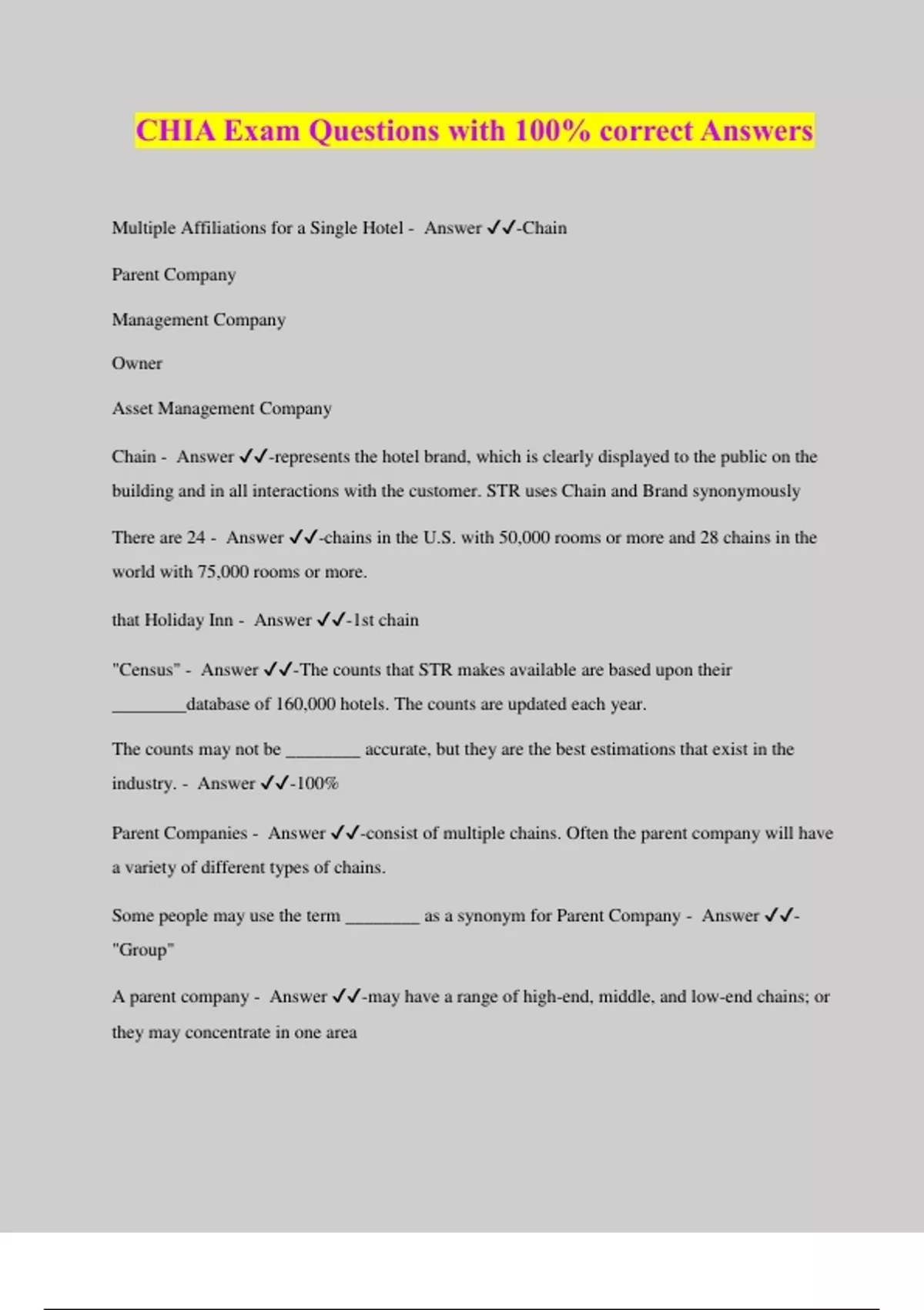 CHIA Exam Questions with 100% correct Answers Multiple Affiliations for a Single Hotel - Answer ️️ -Chain Parent Company Management Company Owner Asset Management Company Chain - Answer ️️ -represents the hotel brand, which is clearly displayed to the public on the building and in all interactions with the customer. STR uses Chain and Brand synonymously There are 24 - Answer ️️ -chains in the U.S. with 50,000 rooms or more and 28 chains in the world with 75,000 rooms or more. that Holiday Inn - Answer ️️ -1st chain "Census" - Answer ️️ -The counts that STR makes available are based upon their ________database of 160,000 hotels. The counts are updated each year. The counts may not be ________ accurate, but they are the best estimations that exist in the industry. - Answer ️️ -100% Parent Companies - Answer ️️ -consist of multiple chains. Often the parent company will have a variety of different types of chains. Some people may use the term ________ as a synonym for Parent Company - Answer ️️ - "Group" A parent company - Answer ️️ -may have a range of high-end, middle, and low-end chains; or they may concentrate in one area There are________parent companies in the U.S. with 10,000 rooms or more and 34 parent companies worldwide with 25,000 rooms or more. - Answer ️️ -22 Parent companies may have hotels around - Answer ️️ -the world or in specific regions STR uses three different operation types: - Answer ️️ -Corporate Franchise Independent hotel is a chain hotel owned and/or managed by the chain or the parent company. - Answer ️️ - Corporate Franchise - Answer ️️ -hotel is a chain hotel run by a third party where the chain receives some sort of franchise fee. An Independent - Answer ️️ -hotel is not affiliated with a chain or parent company. Most _________ will have a mixture of corporate and franchise hotels. - Answer ️️ -parent companies Independent Hotels - Answer ️️ -are not affiliated with a specific chain. They may be managed or owned by companies listed on pages to follow. They may also be members of various marketing groups. Independent hotels vary considerably in - Answer ️️ -size, price level, location, amenities and other attributes. It is possible to obtain a Property and Room Count report to summarize participation by areas or - Answer ️️ -a Participation List to identify specific participating hotels in a country or market. MAnagement Company - Answer ️️ -A management company operates a hotel for another party. The company has a management contract where it receives payment and/or some portion of profits. There are 32 management companies in the U.S. with 8,000 rooms - Answer ️️ -or more and 58 management companies worldwide with 10,000 rooms or more. Management companies may manage a variety of different - Answer ️️ -chains as well as independent hotels Owner Companies - Answer ️️ -There are many companies that own multiple hotels. Owners may own hotels from a variety of different chains There are There are _______ owner companies in the U.S. and 46 owner companies worldwide with 10,000 rooms or more. - Answer ️️ -24 Asset Management Company - Answer ️️ -represents the owner in the operation of a hotel. A hotel may have both - Answer ️️ -a Management Company and an Asset Management Company. There are 30 - Answer ️️ -Asset Management Companies in the U.S. and 39 Asset Management Companies worldwide with 1,000 rooms or greater. Quasi/Soft Brand - Answer ️️ -Autograph by Marriott Luxury Collection by Starwood Andaz by Hyatt Ascend by Choice New Quasi Chains or Soft Brands - Answer ️️ -a cross between a chain and a marketing group for independent hote