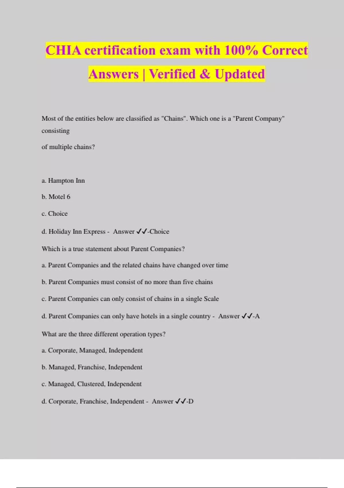 CHIA certification exam with 100% Correct Answers | Verified & Updated Most of the entities below are classified as "Chains". Which one is a "Parent Company" consisting of multiple chains? a. Hampton Inn b. Motel 6 c. Choice d. Holiday Inn Express - Answer ️️ -Choice Which is a true statement about Parent Companies? a. Parent Companies and the related chains have changed over time b. Parent Companies must consist of no more than five chains c. Parent Companies can only consist of chains in a single Scale d. Parent Companies can only have hotels in a single country - Answer ️️ -A What are the three different operation types? a. Corporate, Managed, Independent b. Managed, Franchise, Independent c. Managed, Clustered, Independent d. Corporate, Franchise, Independent - Answer ️️ -D Which is a true statement about independent hotels? a. Independent hotels are not affiliated with a specific chain b. Chain hotels outnumber independent hotels in every country of the world c. Independent hotels are mostly Luxury Class hotels in Urban Locations with more than 150 rooms d. Independent hotels may never be managed by an outside entity - Answer ️️ -A Which is a true statement about Management Companies? a. Management companies have contracts where they receive payment for their services and/or some portion of profits b. Management companies may manage only one chain c. Management companies will always own the hotels they manage d. Management companies serve the exact same role as asset management companies - Answer ️️ -A ) Which is a true statement regarding geographic categorization? a. STR geographic categories are limited to North America b. STR uses the UNWTO definitions when it comes to recognizing countries c. General managers of hotels do not need to know geographic categories d. The hotel industry uses seven continents to categorize hotels - Answer ️️ -B Which is a true statement regarding markets? a. Markets include hotels that are in big cities, not rural areas b. A country would never have more than 100 markets and never have less than 2 markets c. No market will ever cross country boundaries d. There is another name for Markets outside the U.S. - Answer ️️ -C In descending order of geographic size, which option below is correct? a. Continent, Sub-Continent, Country, Tract/Sub-Market, Market b. Continent, Country, Sub-Continent, Tract/Sub-Market, Market c. Continent, Sub-Continent, Market, Country, Tract/Sub-Market d. Continent, Sub-Continent, Country, Market, Tract/Sub-Market - Answer ️️ -D Which two geographic categories are the most important for a hotel GM? a. Region and Market b. Market and Tract/Sub-Market c. Region and Tract/Sub-Market d. Country and Tract/Sub-Market - Answer ️️ -B Markets and tracts are created based on what two determining factors? a. Geographic size and population b. Geographic size and participation c. Number of hotels and participation d. Number of hotels and population - Answer ️️ -C Which is a true statement regarding T