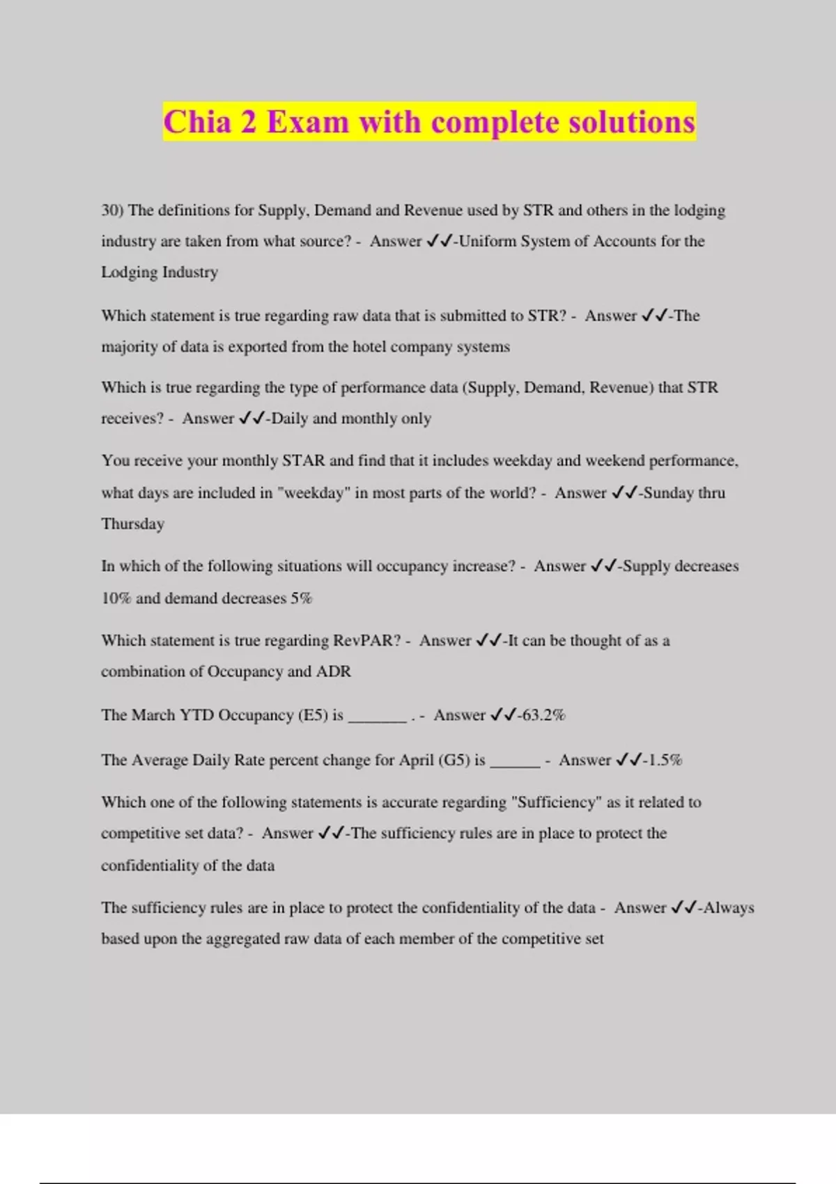 Chia 2 Exam with complete solutions 30) The definitions for Supply, Demand and Revenue used by STR and others in the lodging industry are taken from what source? - Answer ️️ -Uniform System of Accounts for the Lodging Industry Which statement is true regarding raw data that is submitted to STR? - Answer ️️ -The majority of data is exported from the hotel company systems Which is true regarding the type of performance data (Supply, Demand, Revenue) that STR receives? - Answer ️️ -Daily and monthly only You receive your monthly STAR and find that it includes weekday and weekend performance, what days are included in "weekday" in most parts of the world? - Answer ️️ -Sunday thru Thursday In which of the following situations will occupancy increase? - Answer ️️ -Supply decreases 10% and demand decreases 5% Which statement is true regarding RevPAR? - Answer ️️ -It can be thought of as a combination of Occupancy and ADR The March YTD Occupancy (E5) is _______ . - Answer ️️ -63.2% The Average Daily Rate percent change for April (G5) is ______ - Answer ️️ -1.5% Which one of the following statements is accurate regarding "Sufficiency" as it related to competitive set data? - Answer ️️ -The sufficiency rules are in place to protect the confidentiality of the data The sufficiency rules are in place to protect the confidentiality of the data - Answer ️️ -Always based upon the aggregated raw data of each member of the competitive set When you receive your STAR report, your ADR for the month was $100 and the competitive set ADR was $90. What can you tell? - Answer ️️ -Your ADR was $10 higher than the average of all of the members of the com