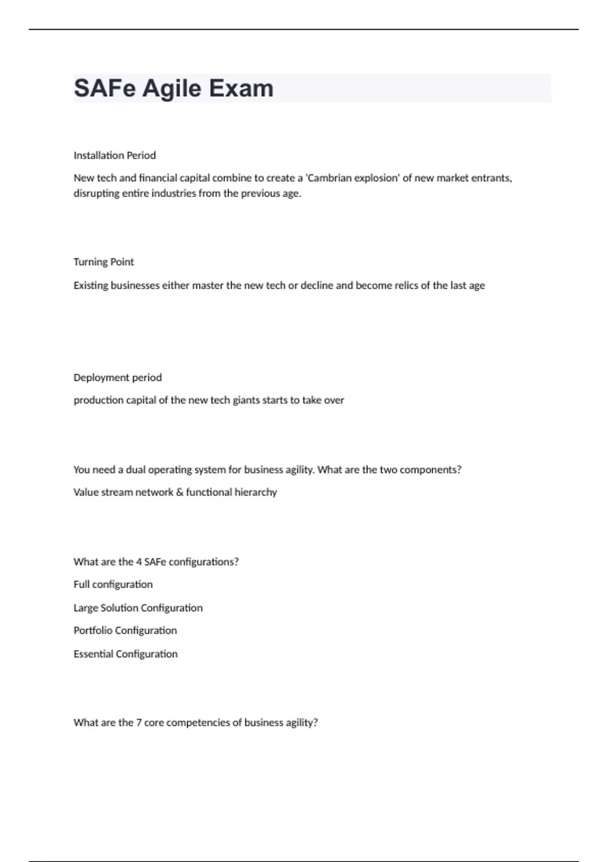 SAFe Agile Exam Installation Period New tech and financial capital combine to create a 'Cambrian explosion' of new market entrants, disrupting entire industries from the previous age. Turning Point Existing businesses either master the new tech or decline and become relics of the last age Deployment period production capital of the new tech giants starts to take over You need a dual operating system for business agility. What are the two components? Value stream network & functional hierarchy What are the 4 SAFe configurations? Full configuration Large Solution Configuration Portfolio Configuration Essential Configuration What are the 7 core competencies of business agility?