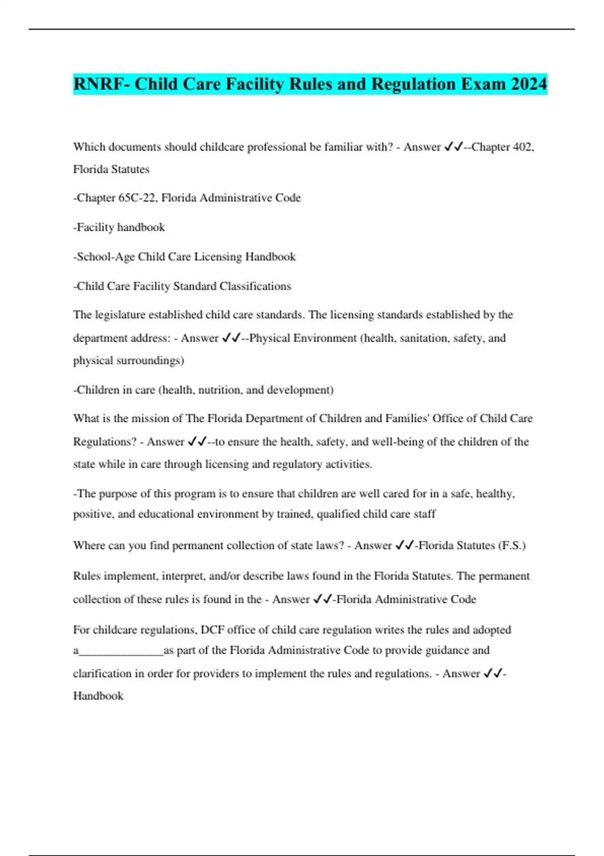 RNRF- Child Care Facility Rules and Regulation Exam 2024 Which documents should childcare professional be familiar with? - Answer ️️ --Chapter 402, Florida Statutes -Chapter 65C-22, Florida Administrative Code -Facility handbook -School-Age Child Care Licensing Handbook -Child Care Facility Standard Classifications The legislature established child care standards. The licensing standards established by the department address: - Answer ️️ --Physical Environment (health, sanitation, safety, and physical surroundings) -Children in care (health, nutrition, and development) What is the mission of The Florida Department of Children and Families' Office of Child Care Regulations? - Answer ️️ --to ensure the health, safety, and well-being of the children of the state while in care through licensing and regulatory activities. -The purpose of this program is to ensure that children are well cared for in a safe, healthy, positive, and educational environment by trained, qualified child care staff Where can you find permanent collection of state laws? - Answer ️️ -Florida Statutes (F.S.) Rules implement, interpret, and/or describe laws found in the Florida Statutes. The permanent collection of these rules is found in the - Answer ️️ -Florida Administrative Code For childcare regulations, DCF office of child care regulation writes the rules and adopted a______________as part of the Florida Administrative Code to provide guidance and clarification in order for providers to implement the rules and regulations. - Answer ️️ - Handbook What is an ordinance? - Answer ️️ -local law enacted by a county or municipality and only applies within the jurisdiction of the particular county or city Child Care Personnel (F.S.) - Answer ️️ -Includes all owners, operators, employees, and volunteers working in a child care facility Classroom/room/designated space (handbook) - Answer ️️ -a space or room in which care is provided or classes are held, and where learning can take place uninterrupted by outside distractions Department (F.S.) - Answer ️️ -Means the Department of Children and Families Direct Supervision (Handbook) - Answer ️️ -actively watching and directing children's activities within the same space, and responding to the needs of each child while in care Director (handbook) - Answer ️️ -On-site administrator or individual who has the primary responsibility for the day to day operation, supervision, and administration of a child care facility Foster Grandparents (handbook) - Answer ️️ -directly supervised volunteers who participate in the federal program pursuant to 45 code of Federal Regulations part 2552; they work with one or more children with special or exceptional needs in child care programs Owner (F.S.) - Answer ️️ -The person who is licensed to operate the child care facility Sanitize (Handbook) - Answer ️️ -the process of destroying or reducing organisms to a safe level stable walls or barriers (handbook) - Answer ️️ -the boundaries that define a classroom space, which are constructed in a sturdy manner and anchored so they are stable and secure and do not pose a threat of falling over. weekend child care (F.S.) - Answer ️️ -Child care provided between the hours of 6pm on Friday and 6am on Mon