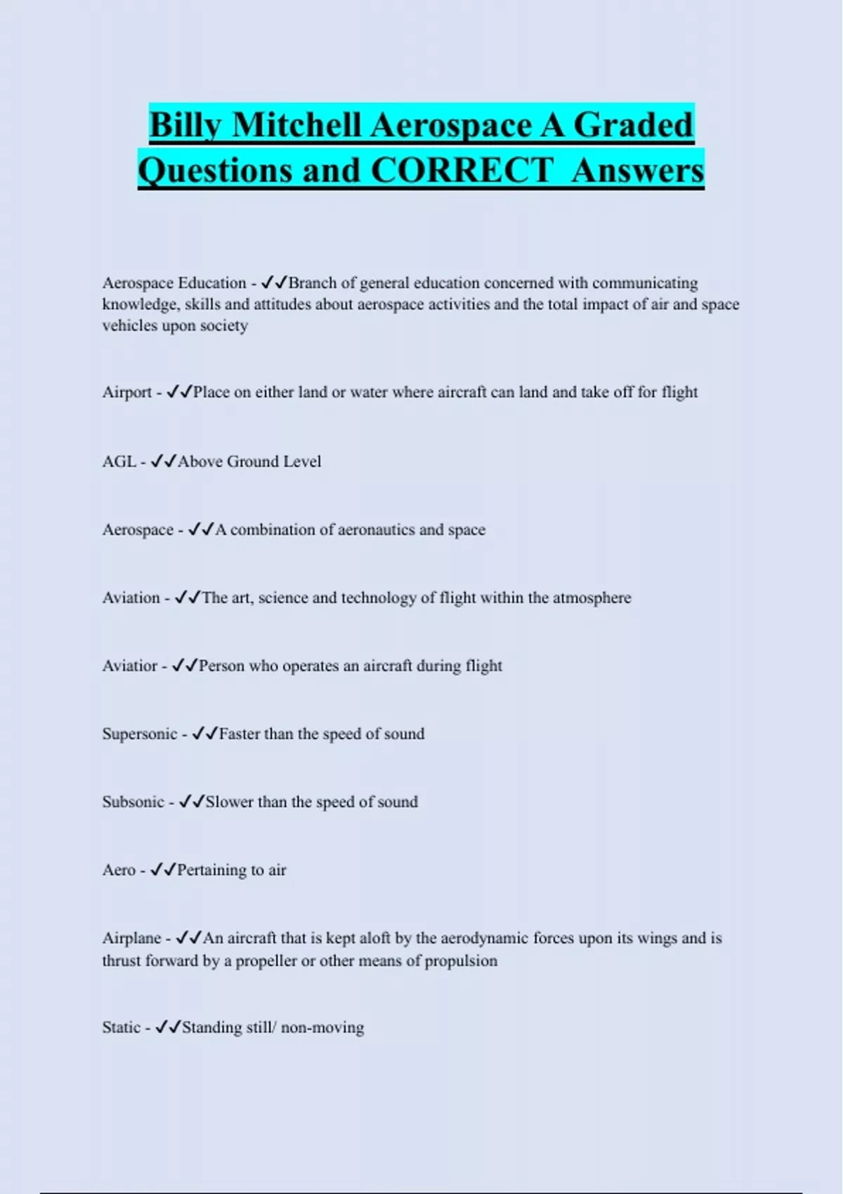 Billy Mitchell Aerospace A Graded Questions and CORRECT Answers