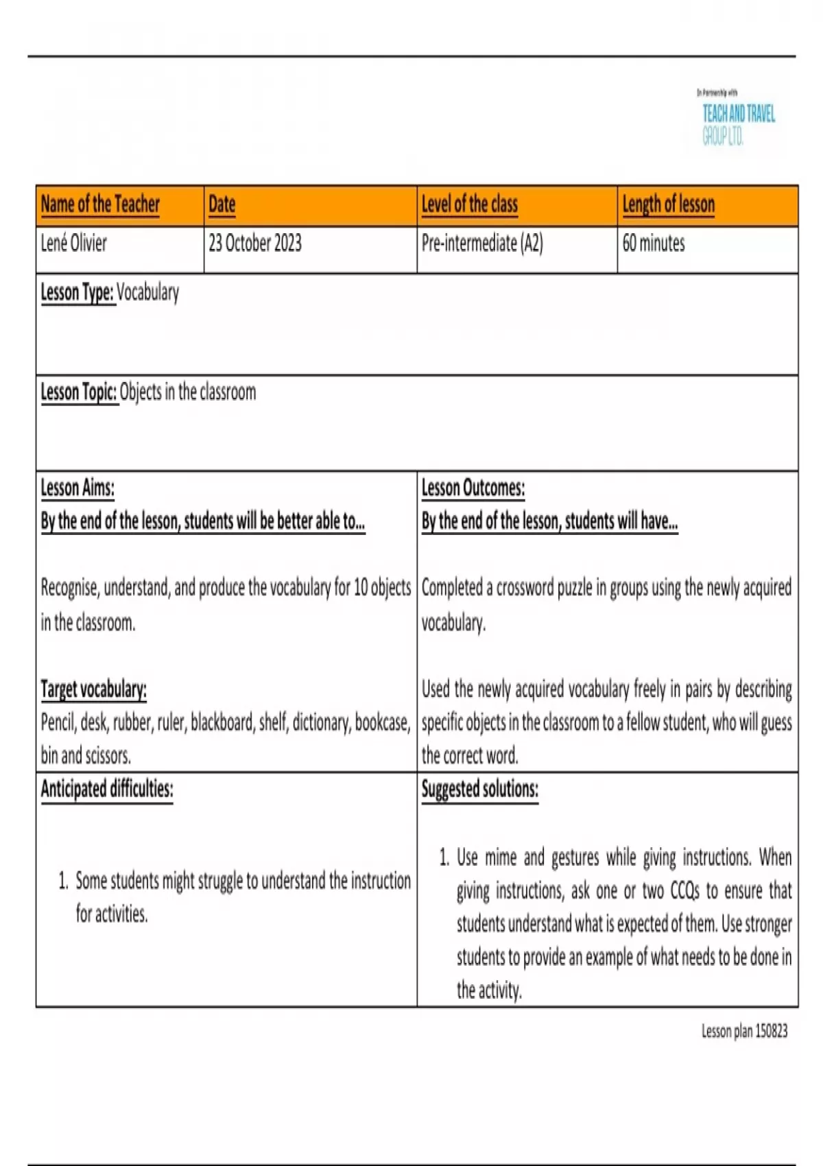 i-to-i 180-hour TEFL assignment 1. Vocabulary - Objects in the classroom.Passed with good feedback