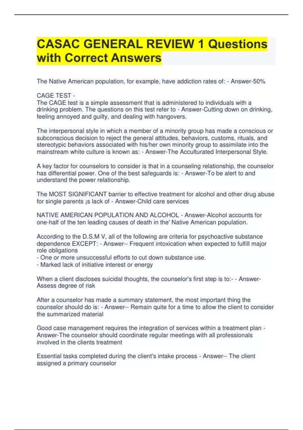 CASAC GENERAL REVIEW 1 Questions with Correct Answers The Native American population, for example, have addiction rates of: - Answer-50% CAGE TEST - The CAGE test is a simple assessment that is administered to individuals with a drinking problem. The questions on this test refer to - Answer-Cutting down on drinking, feeling annoyed and guilty, and dealing with hangovers. The interpersonal style in which a member of a minority group has made a conscious or subconscious decision to reject the general attitudes, behaviors, customs, rituals, and stereotypic behaviors associated with his/her own minority group to assimilate into the mainstream white culture is known as: - Answer-The Acculturated Interpersonal Style. A key factor for counselors to consider is that in a counseling relationship, the counselor has differential power. One of the best safeguards is: - Answer-To be alert to and understand the power relationship. The MOST SIGNIFICANT barrier to effective treatment for alcohol and other drug abuse for single parents ¡s lack of - Answer-Child care services NATIVE AMERICAN POPULATION AND ALCOHOL - Answer-Alcohol accounts for one-half of the ten leading causes of death in the' Native American population. According to the D.S.M V, all of the following are criteria for psychoactive substance dependence EXCEPT: - Answer-- Frequent intoxication when expected to fulfill major role obligations - One or more unsuccessful efforts to cut down substance use. - Marked lack of initiative interest or energy
