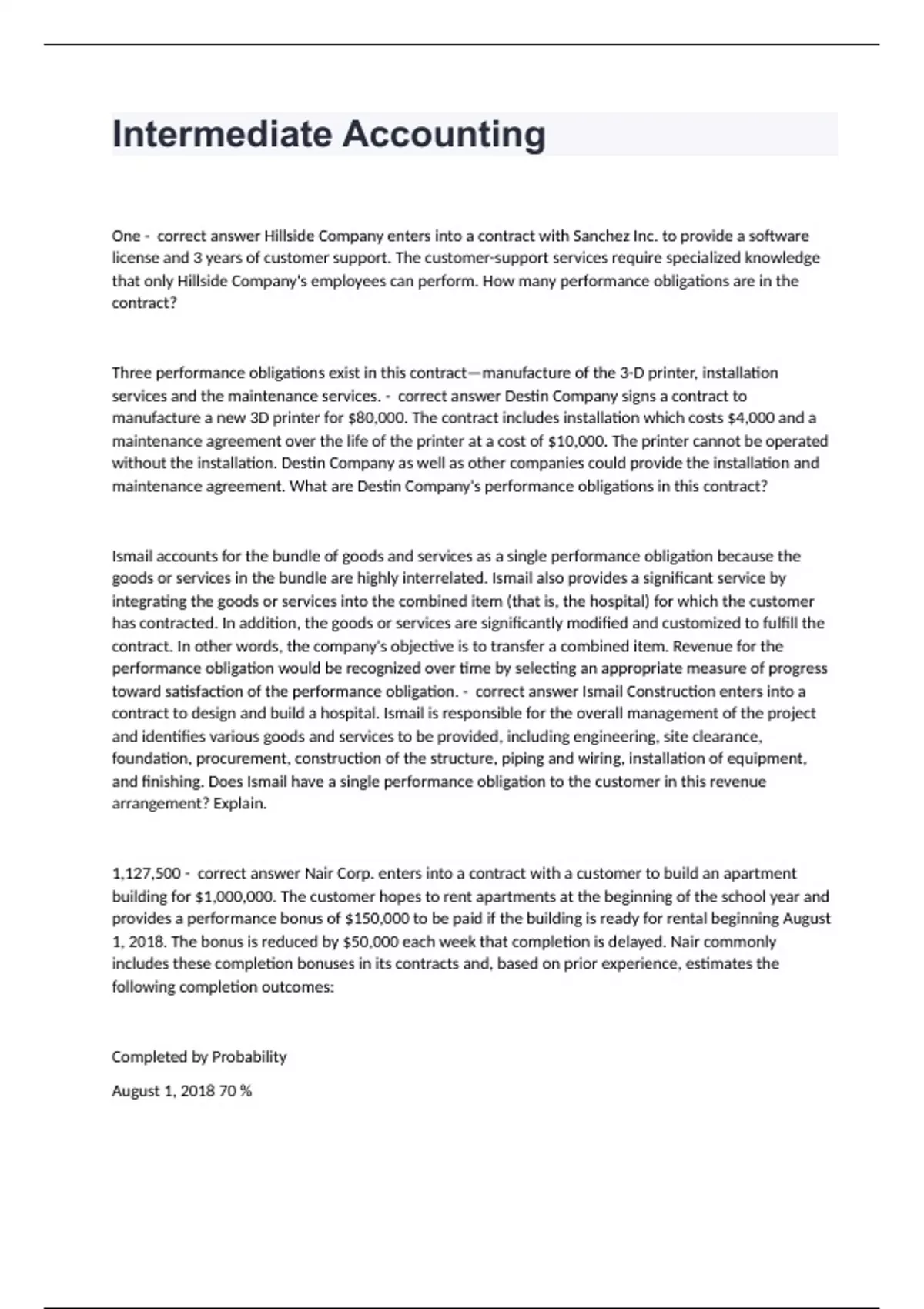 Intermediate AccountingOne - correct answer Hillside Company enters into a contract with Sanchez Inc. to provide a software license and 3 years of customer support. The customer-support services require specialized knowledge that only Hillside Company's employees can perform. How many performance obligations are in the contract? Three performance obligations exist in this contract—manufacture of the 3-D printer, installation services and the maintenance services. - correct answer Destin Company signs a contract to manufacture a new 3D printer for $80,000. The contract includes installation which costs $4,000 and a maintenance agreement over the life of the printer at a cost of $10,000. The printer cannot be operated without the installation. Destin Company as well as other companies could provide the installation and maintenance agreement. What are Destin Company's performance obligations in this contract? Ismail accounts for the bundle of goods and services as a single performance obligation because the goods or services in the bundle are highly interrelated. Ismail also provides a significant service by integrating the goods or services into the combined item (that is, the hospital) for which the customer has contracted. In addition, the goods or services are significantly modified and customized to fulfill the contract. In other words, the company's objective is to transfer a combined item. Revenue for the performance obligation would be recognized over time by selecting an appropriate measure of progress toward satisfaction of the performance obligation. - correct answer Ismail Construction enters into a contract to design and build a hospital. Ismail is responsible for the overall management of the project and identifies various goods and services to be provided, including engineering, site clearance, foundation, procurement, construction of the structure, piping and wiring, installation of equipment, and finishing. Does Ismail have a single performance obligation to the customer in this revenue arrangement? Explain. 1,127,500 - correct answer Nair Corp. enters into a contract with a customer to build an apartment building for $1,000,000. The customer hopes to rent apartments at the beginning of the school year and provides a performance bonus of $150,000 to be paid if the building is ready for rental beginning August 1, 2018. The bonus is reduced by $50,000 each week that completion is delayed. Nair commonly includes these completion bonuses in its contracts and, based on prior experience, estimates the following completion outcomes: Completed by Probability August 1, 2018 70 %