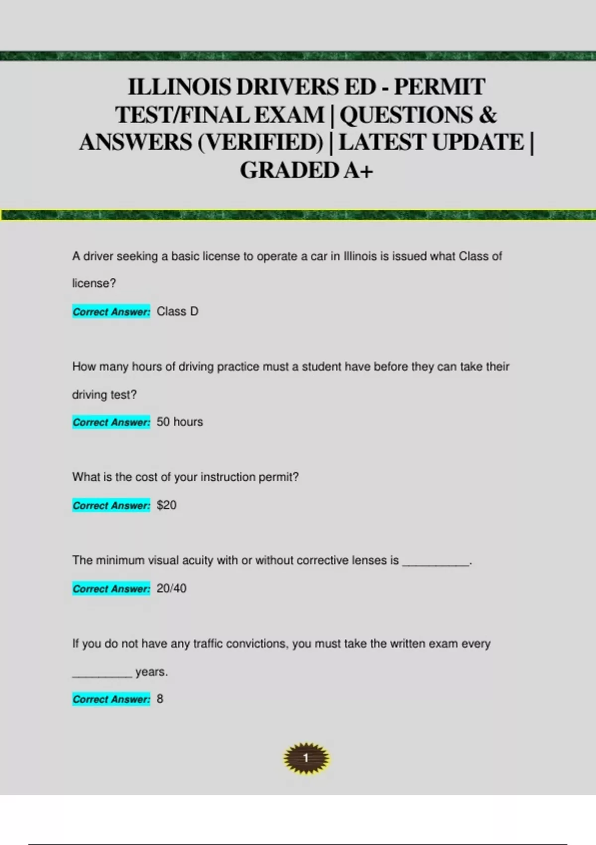 ILLINOIS DRIVERS ED - PERMIT TEST/FINAL EXAM | QUESTIONS & ANSWERS (VERIFIED) | LATEST UPDATE | GRADED A+ A driver seeking a basic license to operate a car in Illinois is issued what Class of license? Correct Answer: Class D How many hours of driving practice must a student have before they can take their driving test? Correct Answer: 50 hours What is the cost of your instruction permit? Correct Answer: $20 The minimum visual acuity with or without corrective lenses is __________. Correct Answer: 20/40 If you do not have any traffic convictions, you must take the written exam every _________ years. Correct Answer: 8 2 True or False; During the Initial Licensing Phase, a teen driver is allowed only two passengers under age 20 in the vehicle during the first 12 months of licensing. Correct Answer: True True or False; In order to obtain court supervision for a traffic violation, a minor must appear in court with a parent/legal guardian and attend a traffic safety school. Correct Answer: True True or False; A parent or legal guardian may request that the driver's license of a minor be canceled at any time prior to age 18. Correct Answer: True True or False; Illinois drivers under age 16 are required to have at least 25 hours of behind-the-wheel supervised driving before obtaining their driver's license * Correct Answer: False True or False; Drivers under age 20 are prohibited from using their cellphone while driving except in the case of an emergency. Correct Answer: True True or False; Drivers under age 18 must hold their instruction permit for six consecutive months prior to obtaining their driver's license. 3 Correct Answer: False True or False; When passing another vehicle, a driver should wait until the entire car the driver just passed is visible in the rear view mirror before turning back into the righthand lane. Correct Answer: True