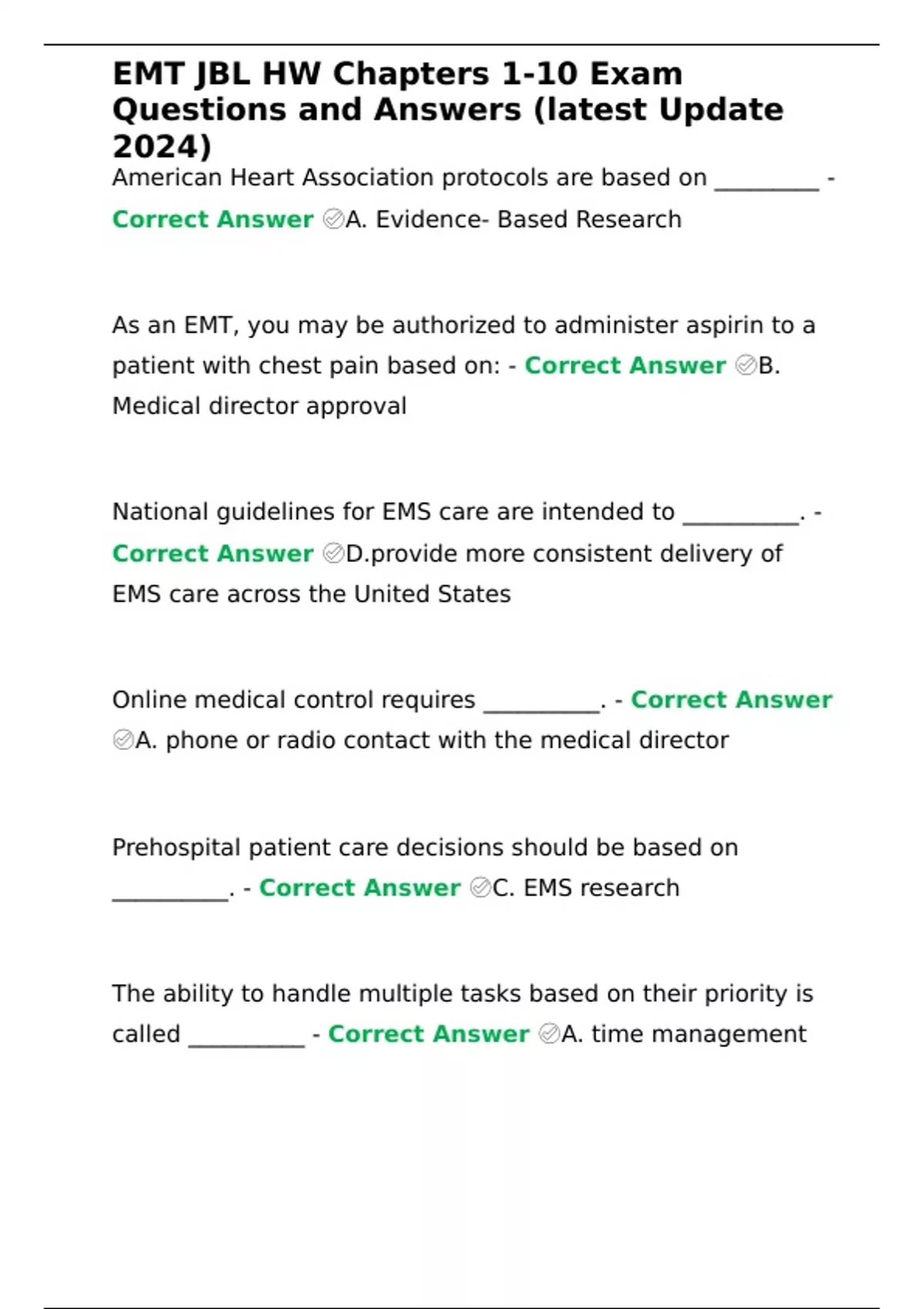 EMT JBL HW Chapters 1-10 Exam Questions and Answers (latest Update 2024)