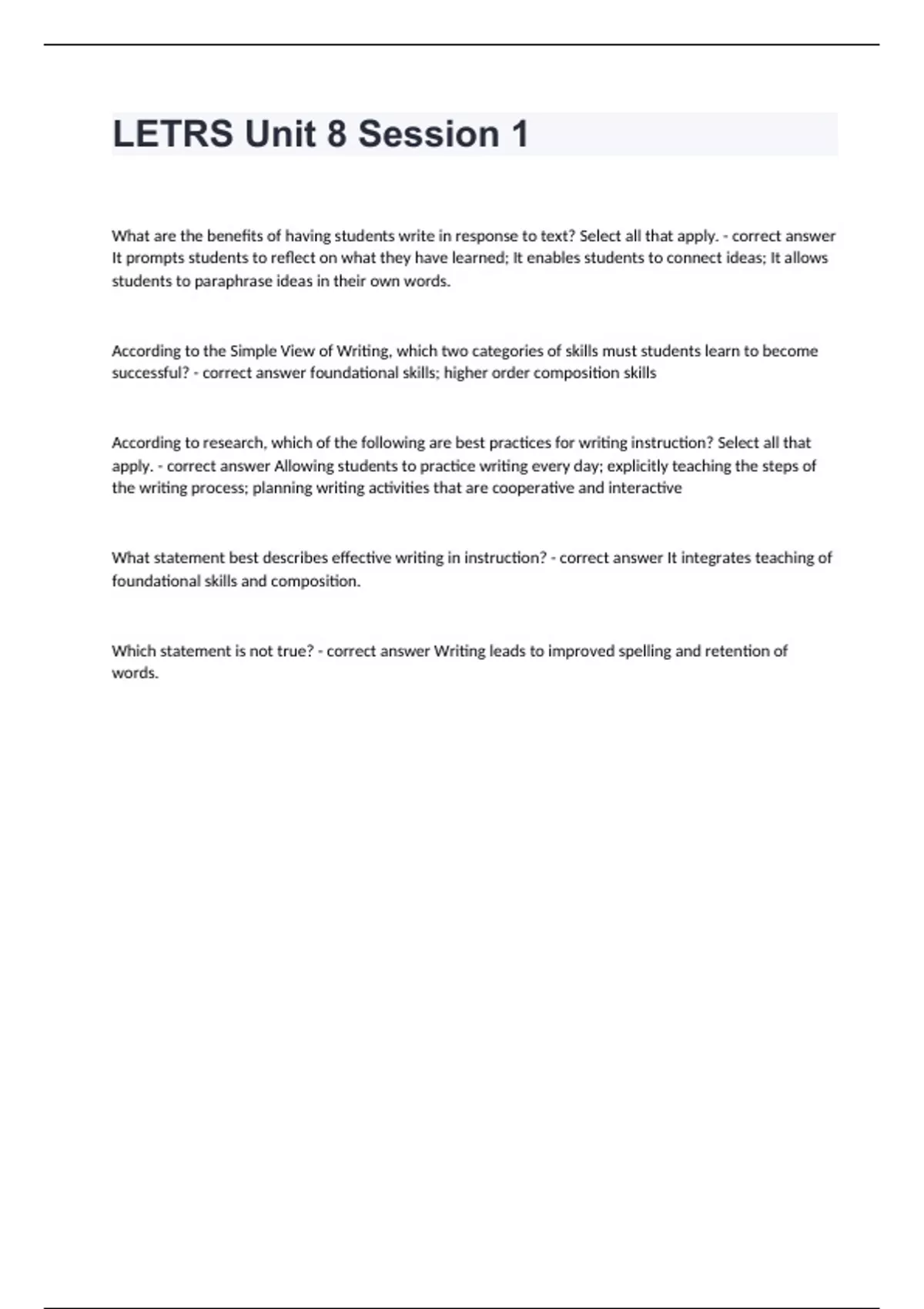 What are the benefits of having students write in response to text? Select all that apply. - correct answer It prompts students to reflect on what they have learned; It enables students to connect ideas; It allows students to paraphrase ideas in their own words. According to the Simple View of Writing, which two categories of skills must students learn to become successful? - correct answer foundational skills; higher order composition skills According to research, which of the following are best practices for writing instruction? Select all that apply. - correct answer Allowing students to practice writing every day; explicitly teaching the steps of the writing process; planning writing activities that are cooperative and interactive What statement best describes effective writing in instruction? - correct answer It integrates teaching of foundational skills and composition. Which statement is not true? - correct answer Writing leads to improved spelling and retention of words.