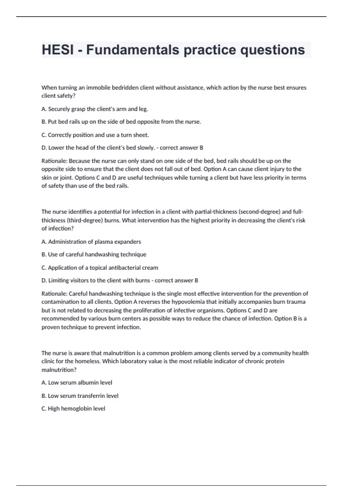 When turning an immobile bedridden client without assistance, which action by the nurse best ensures client safety? A. Securely grasp the client's arm and leg. B. Put bed rails up on the side of bed opposite from the nurse. C. Correctly position and use a turn sheet. D. Lower the head of the client's bed slowly. - correct answer B Rationale: Because the nurse can only stand on one side of the bed, bed rails should be up on the opposite side to ensure that the client does not fall out of bed. Option A can cause client injury to the skin or joint. Options C and D are useful techniques while turning a client but have less priority in terms of safety than use of the bed rails. The nurse identifies a potential for infection in a client with partial-thickness (second-degree) and full-thickness (third-degree) burns. What intervention has the highest priority in decreasing the client's risk of infection? A. Administration of plasma expanders B. Use of careful handwashing technique C. Application of a topical antibacterial cream D. Limiting visitors to the client with burns - correct answer B Rationale: Careful handwashing technique is the single most effective intervention for the prevention of contamination to all clients. Option A reverses the hypovolemia that initially accompanies burn trauma but is not related to decreasing the proliferation of infective organisms. Options C and D are recommended by various burn centers as possible ways to reduce the chance of infection. Option B is a proven technique to prevent infection. The nurse is aware that malnutrition is a common problem among clients served by a community health clinic for the homeless. Which laboratory value is the most reliable indicator of chronic protein malnutrition? A. Low serum albumin level B. Low serum transferrin level C. High hemoglobin level D. High cholesterol level - correct answer A Rationale: Long-term protein deficiency is required to cause significantly lowered serum albumin levels. Albumin is made by the liver only when adequate amounts of amino acids (from protein breakdown) are available. Albumin has a long half-life, so acute protein loss does not significantly alter serum levels. Option B is a serum protein with a half-life of only 8 to 10 days, so it will drop with an acute protein deficiency. Options C and D are not clinical measures of protein malnutrition. In completing a client's preoperative routine, the nurse finds that the operative permit is not signed. The client begins to ask more questions about the surgical procedure. Which action should the nurse take next? A. Witness the client's signature to the permit. B. Answer the client's questions about the surgery. C. Inform the surgeon that the operative permit is not signed and the client has questions about the surgery. D. Reassure the client that the surgeon will answer any questions before the anesthesia is administered. - correct answer C Rationale: The surgeon should be informed immediately that the permit is not signed. It is the surgeon's responsibility to explain the procedure to the client and obtain the client's signature on the permit. Although the nurse can witness an operative permit, the procedure must first be explained by the health care provider or surgeon, including answering the client's questions. The client's questions should be addressed before the permit is signed. The nurse is assessing several clients prior to surgery. Which factor in a client's history poses the greatest threat for complications to occur during surgery? A. Taking birth control pills for the past 2 years B. Taking anticoagulants for the past year C. Recently completing antibiotic therapy D. Having taken laxatives PRN for the last 6 months - correct answer B Rationale: Anticoagulants increase the risk for bleeding during surgery, which can pose a threat for the development of surgical complications. The health care provider should be informed that the client is taking these drugs. Although clients who take birth control pills may be more susceptible to the development of thrombi, such problems usually occur postoperatively. A client with option C or D is at less of a surgical risk than with option B. When assisting a client from the bed to a chair, which procedure is best for the nurse to follow? A. Place the chair parallel to the bed, with its back toward the head of the bed and assist the client in moving to the chair. B. With the nurse's feet spread apart and knees aligned with the client's knees, stand and pivot the client into the chair. C. Assist the client to a standing position by gently lifting upward, underneath the axillae. D. Stand beside the client, place the client's arms around the nurse's neck, and gently move the client to the chair. - correct answer B Rationale: Option B describes the correct positioning of the nurse and affords the nurse a wide base of support while stabilizing the client's knees when assisting to a standing position. The chair should be placed at a 45-degree angle to the bed, with the back of the chair toward the head of the bed. Clients should never be lifted under the axillae; this could damage nerves and strain the nurse's back. The client should be instructed to use the arms of the chair and should never place his or her arms around the nurse's neck; this places undue stress on the nurse's neck and back and increases the risk for a fall. Which step(s) should the nurse take when administering ear drops to an adult client? (Select all that apply.) A. Place the client in a side-lying position. B. Pull the auricle upward and outward. C. Hold the dropper 6 cm above the ear canal. D. Place a cotton ball into the inner canal. E. Pull the auricle down and back. - correct answer A, B Rationale: The correct answers (A and B) are the appropriate administration of ear drops. The dropper should be held 1 cm (½ inch) above the ear canal (C). A cotton ball should be placed in the outermost canal (D). The auricle is pulled down and back 