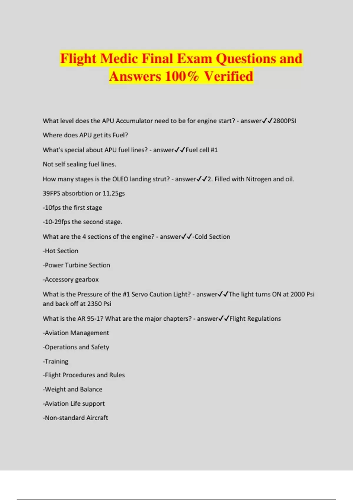 Flight Medic Final Exam Questions and Answers 100% Verified What level does the APU Accumulator need to be for engine start? - answer2800PSI Where does APU get its Fuel? What's special about APU fuel lines? - answerFuel cell #1 Not self sealing fuel lines. How many stages is the OLEO landing strut? - answer2. Filled with Nitrogen and oil. 39FPS absorbtion or 11.25gs -10fps the first stage -10-29fps the second stage. What are the 4 sections of the engine? - answer-Cold Section -Hot Section -Power Turbine Section -Accessory gearbox What is the Pressure of the #1 Servo Caution Light? - answerThe light turns ON at 2000 Psi and back off at 2350 Psi What is the AR 95-1? What are the major chapters? - answerFlight Regulations -Aviation Management -Operations and Safety -Training -Flight Procedures and Rules -Weight and Balance -Aviation Life support -Non-standard Aircraft -Army Flying Hour Program Difference between CASEVAC vs. MEDEVAC? - answerMEDEVAC - Medical Evacuation using a dedicated Medical platform CASEVAC - Casualty Evacuation using a non-medical Platform Difference between Combat Support Hospital vs. Forward Surgical Team? - answer-FST Small mobile surgical units and can stand alone or support elements. Role 2 -CASH capable of providing definitive care for many cases, further back from front line. Role 3 Where is the placement for the Needle Chest Decompression? - answerPrimary -2nd intercostal space, mid-clavicular line on affected