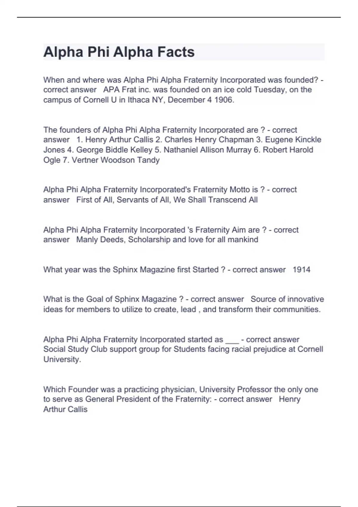 Alpha Phi Alpha Facts Question and answers already passed 2024When and where was Alpha Phi Alpha Fraternity Incorporated was founded? - correct answer APA Frat inc. was founded on an ice cold Tuesday, on the campus of Cornell U in Ithaca NY, December 4 1906. The founders of Alpha Phi Alpha Fraternity Incorporated are ? - correct answer 1. Henry Arthur Callis 2. Charles Henry Chapman 3. Eugene Kinckle Jones 4. George Biddle Kelley 5. Nathaniel Allison Murray 6. Robert Harold Ogle 7. Vertner Woodson Tandy Alpha Phi Alpha Fraternity Incorporated's Fraternity Motto is ? - correct answer First of All, Servants of All, We Shall Transcend All Alpha Phi Alpha Fraternity Incorporated 's Fraternity Aim are ? - correct answer Manly Deeds, Scholarship and love for all mankind What year was the Sphinx Magazine first Started ? - correct answer 1914 What is the Goal of Sphinx Magazine ? - correct answer Source of innovative ideas for members to utilize to create, lead , and transform their communities. Alpha Phi Alpha Fraternity Incorporated started as ___ - correct answer Social Study Club support group for Students facing racial prejudice at Cornell University. Which Founder was a practicing physician, University Professor the only one to serve as General Preside