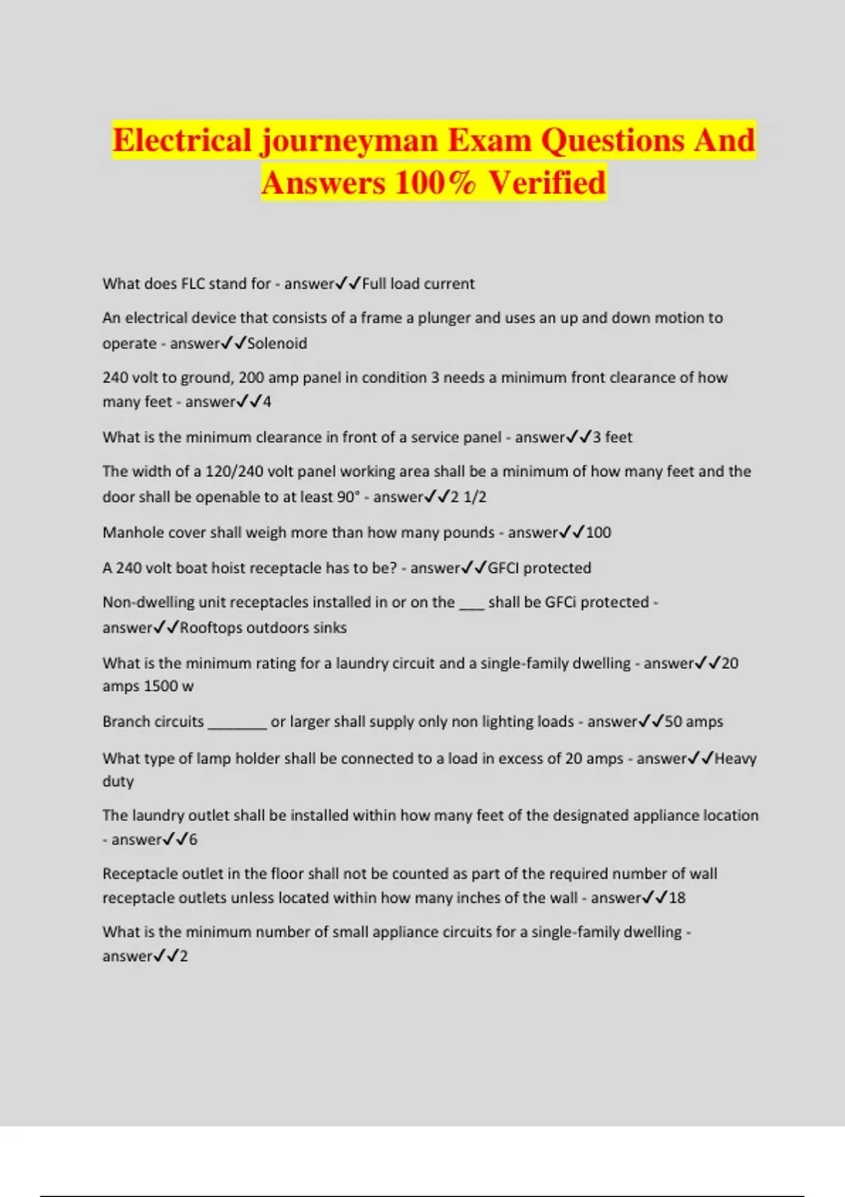 Electrical journeyman Exam Questions And Answers 100% Verified What does FLC stand for - answerFull load current An electrical device that consists of a frame a plunger and uses an up and down motion to operate - answerSolenoid 240 volt to ground, 200 amp panel in condition 3 needs a minimum front clearance of how many feet - answer4 What is the minimum clearance in front of a service panel - answer3 feet The width of a 120/240 volt panel working area shall be a minimum of how many feet and the door shall be openable to at least 90° - answer2 1/2 Manhole cover shall weigh more than how many pounds - answer100 A 240 volt boat hoist receptacle has to be? - answerGFCI protected Non-dwelling unit receptacles installed in or on the ___ shall be GFCi protected - answerRooftops outdoors sinks What is the minimum rating for a laundry circuit and a single-family dwelling - answer20 amps 1500 w Branch circuits _______ or larger shall supply only non lighting loads - answer50 amps What type of lamp holder shall be connected to a load in excess of 20 amps - answerHeavy duty The laundry outlet shall be installed within how many feet of the designated appliance location - answer6 Receptacle outlet in the floor shall not be counted as part of the required number of wall receptacle outlets unless located within how many inches of the wall - answer18 What is the minimum number of small appliance circuits for a single-family dwelling - answer2 Other than countertop appliances what type of device is allowed to utilize the small appliance circuits in a single family dwelling - answerRefrigerator clocks cooking equipment Receptacle outlets shall be installed so that no point along the wall line of a kitchen countertop is more than how many inches measured horizontally from a receptacle outlet in that space - answer24 What is the minimum length of a countertop in a kitchen that requires the installation of a receptacle - answer12 inches Island countertops, with a minimum of dimension of 12" w x 24" D must have at least how many receptacle outlets - answer1 18 ft of show window requires how many receptacles above window - answer2 one every 12' What is the maximum distance from a rooftop unit that the rooftop GFCI service receptacle shall be located - answer25' A conference room is 250 ft and has a 12.5 ft wall how many floor receptacles are needed - answer1 Does a vehicle garage door require illumination under the illuminated entryway rule - answerNo it needs a hinge General branch circuit lighting load for a hospital Shelby calculated at ______ watts per square foot - answer2 Indwelling units new additions to the lighting branch circuit Shelby calculated in accordance with 220.12 when over ______ square feet - answer500 Where SE cable enters the building the conduit has to be - answerSealed The conductors for festoon lighting shall be supported by messenger wire and all spans exceeding - answer40 ' What is the minimum service rating for a single-family dwelling with six or more two wire Branch circuits - answer100