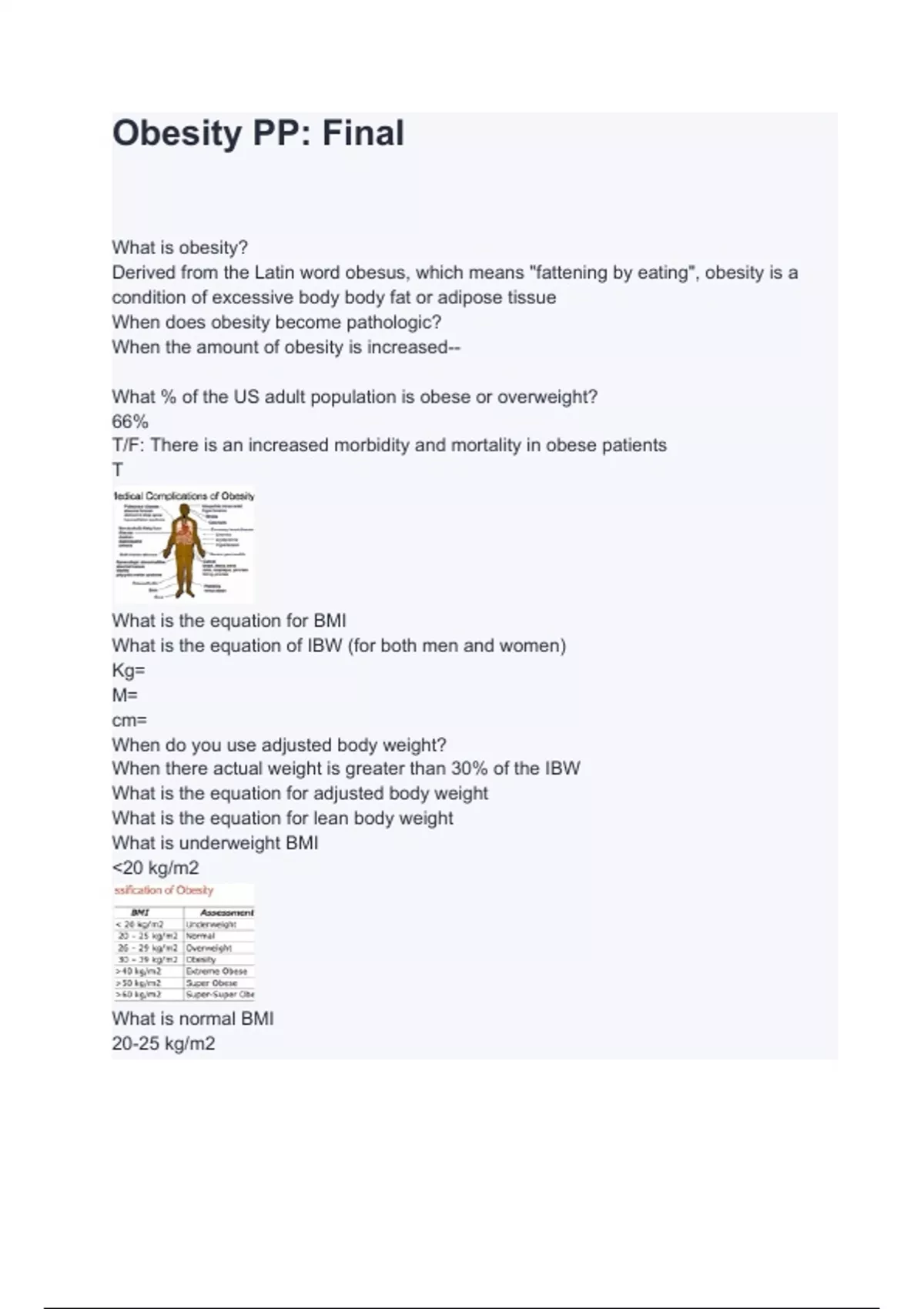 Obesity PP: Final What is obesity? Derived from the Latin word obesus, which means "fattening by eating", obesity is a condition of excessive body body fat or adipose tissue When does obesity become pathologic? When the amount of obesity is increased-- What % of the US adult population is obese or overweight? 66% T/F: There is an increased morbidity and mortality in obese p