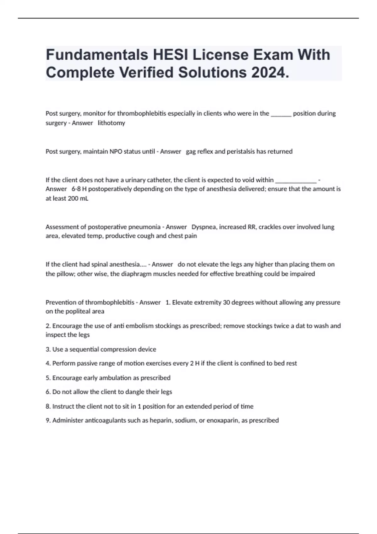 Post surgery, monitor for thrombophlebitis especially in clients who were in the ______ position during surgery - Answer lithotomy Post surgery, maintain NPO status until - Answer gag reflex and peristalsis has returned If the client does not have a urinary catheter, the client is expected to void within ____________ - Answer 6-8 H postoperatively depending on the type of anesthesia delivered; ensure that the amount is at least 200 mL Assessment of postoperative pneumonia - Answer Dyspnea, increased RR, crackles over involved lung area, elevated temp, productive cough and chest pain If the client had spinal anesthesia.... - Answer do not elevate the legs any higher than placing them on the pillow; other wise, the diaphragm muscles needed for effective breathing could be impaired Prevention of thrombophlebitis - Answer 1. Elevate extremity 30 degrees without allowing any pressure on the popliteal area 2. Encourage the use of anti embolism stockings as prescribed; remove stockings twice a dat to wash and inspect the legs 3. Use a sequential compression device 4. Perform passive range of motion exercises every 2 H if the client is confined to bed rest 5. Encourage early ambulation as prescribed 6. Do not allow the client to dangle their legs 8. Instruct the client not to sit in 1 position for an extended period of time 9. Administer anticoagulants such as heparin, sodium, or enoxaparin, as prescribed
