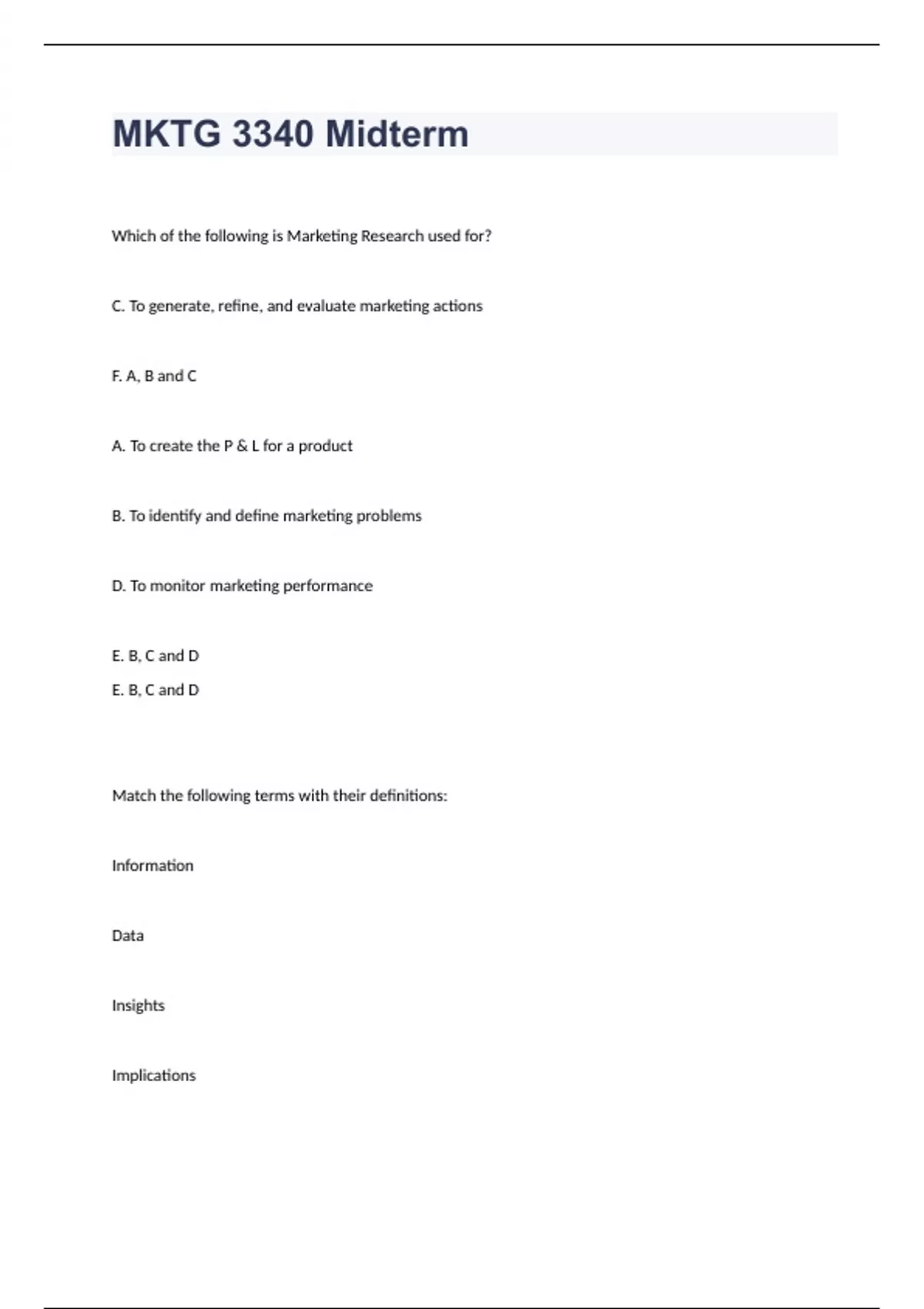 MKTG 3340 Midterm Questions with complete solution 2024Which of the following is Marketing Research used for? C. To generate, refine, and evaluate marketing actions F. A, B and C A. To create the P & L for a product B. To identify and define marketing problems D. To monitor marketing performance E. B, C and D E. B, C and D Match the following terms with their definitions: Information Data
