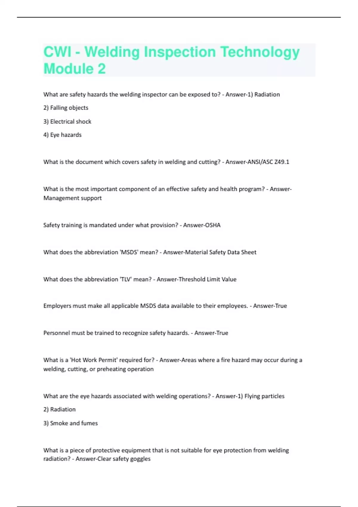 What are safety hazards the welding inspector can be exposed to? - Answer-1) Radiation 2) Falling objects 3) Electrical shock 4) Eye hazards What is the document which covers safety in welding and cutting? - Answer-ANSI/ASC Z49.1 What is the most important component of an effective safety and health program? - AnswerManagement support Safety training is mandated under what provision? - Answer-OSHA What does the abbreviation 'MSDS' mean? - Answer-Material Safety Data Sheet What does the abbreviation 'TLV' mean? - Answer-Threshold Limit Value Employers must make all applicable MSDS data available to their employees. - Answer-True Personnel must be trained to recognize safety hazards. - Answer-True What is a 'Hot Work Permit' required for? - Answer-Areas where a fire hazard may occur during a welding, cutting, or preheating operation What are the eye hazards associated with welding operations? - Answer-1) Flying particles 2) Radiation 3) Smoke and fumes What is a piece of protective equipment that is not suitable for eye protection from welding radiation? - Answer-Clear safety gogglesSuitable clothing materials for welding and cutting are: - Answer-1) Wool 2) Chemically treated cotton Before working on equipment where machinery guards have been removed, a 'Lock, Tag, and Try' procedure should be completed. - Answer-True What is the most important factor in avoiding fumes when welding? - Answer-The position of the welders head It is not important to consider ventilation during welding and cutting operations. - Answer-False