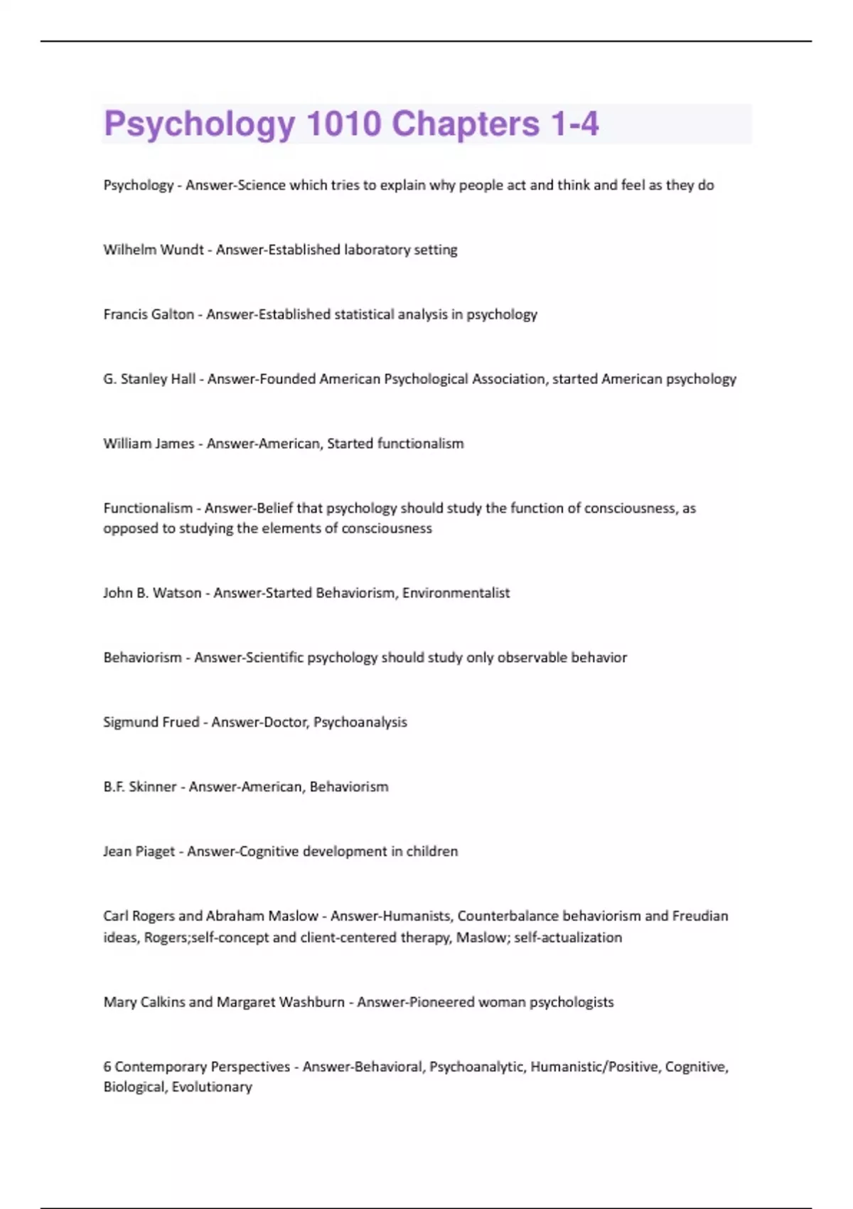 Psychology - Answer-Science which tries to explain why people act and think and feel as they do Wilhelm Wundt - Answer-Established laboratory setting Francis Galton - Answer-Established statistical analysis in psychology G. Stanley Hall - Answer-Founded American Psychological Association, started American psychology William James - Answer-American, Started functionalism Functionalism - Answer-Belief that psychology should study the function of consciousness, as opposed to studying the elements of consciousness John B. Watson - Answer-Started Behaviorism, Environmentalist Behaviorism - Answer-Scientific psychology should study only observable behavior Sigmund Frued - Answer-Doctor, Psychoanalysis B.F. Skinner - Answer-American, Behaviorism Jean Piaget - Answer-Cognitive development in children Carl Rogers and Abraham Maslow - Answer-Humanists, Counterbalance behaviorism and Freudian ideas, Rogers;self-concept and client-centered therapy, Maslow; self-actualization Mary Calkins and Margaret Washburn - Answer-Pioneered woman psychologists 6 Contemporary Perspectives - Answer-Behavioral, Psychoanalytic, Humanistic/Positive, Cognitive, Biological, EvolutionaryBehavioral - Answer-learning, behavior modification, conditioning, effects of reinforcement and punishment Psychoanalytic - Answer-therapies, impacts of the unconscious, defense mechanisms, effects of early childhood experiences Humanistic/Positive - Answer-therapies, people as rational beings, emphasis on positive adjustment and growth Cognitive - Answer-information processing, memory, brain research, learning disabilities, and alternate states of consciousness Biological - Answer-physiological impacts on thinking, feeling, and action, along with genetic effects Evolutionary - Answer-adaptive value of behaviors, along with vestiges of behavioral patterns developed and passed on from our ancestors Psychology is _______ and ________ - Answer-empirical, acquired through systematic observation; Theoretically diverse, wealth of competing viewpoints Psychology evolves in "________" context. - Answer-sociohistorical, Society and psychology influence each other Behavior is determined by _______. - Answer-Multi-factorial causation Behavior is shaped by _______ ________. - Answer-Cultural heritage, heredity and environment jointly influence behavior : experiences are highly subjective Psychiatry - Answer-MD, specialty, hospitals, perscriptions Clinical Psychology - Answer-PhD, therapy, diagnose Counseling Psychology - Answer-Diverse, therapyEducation/School Psychology - Answer-School setting and issues Industrial/Organizational Psychology - Answer-Workplace, max efficiency Academic Psychology - Answer-Teach Assumption - Answer-Events are governed by discernible laws or principles that have some consistency Measurement and Description - Answer-Define phenomenon under study and determine methods for measuring them Understanding and Prediction - Answer-Understanding is evaluated by making and testing predictions Application and Control - Answer-Increased knowledge allows practical applications and control over phenomena Steps to Scientific Investigation - Answer-Observe, Predict, Test, Interpret, Communicate Advantages of Scientific Approach - Answer-Clarity and Precision, Intolerance of error Independent Variable - Answer-the item being manipulated Dependent Variable - Answer-the item being affected and measured Experimental Group - Answer-subjects who receive special treatment with manipulated independent variable Control Group - Answer-similar subjects who do not receive the special treatment given to the other groupExtraneous Variables - Answer-variables other than the independent variable, make it difficult to isolate the actual effects of independent variable Confounding of Variables - Answer-linkage causes problems sorting out specific effects Assignment of Subjects must be _______ - Answer-random