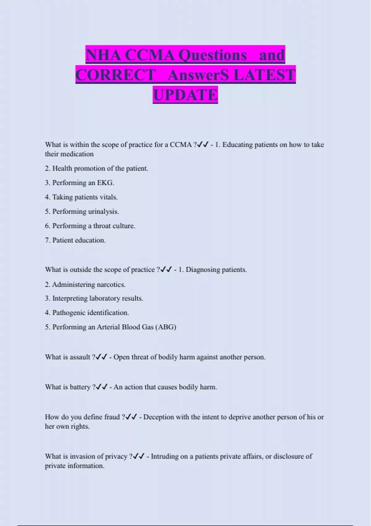 NHA CCMA Questions and CORRECT AnswerS LATEST UPDATE