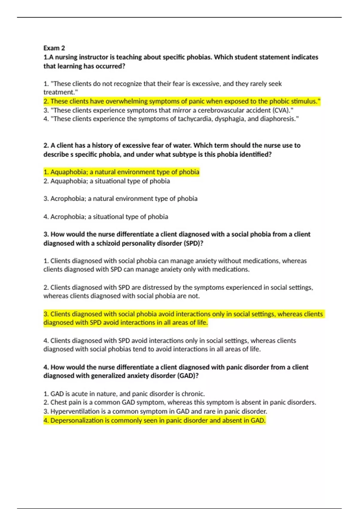 A nursing instructor is teaching about specific phobias. Which student statement indicates that learning has occurred? 1. "These clients do not recognize that their fear is excessive, and they rarely seek treatment." 2. These clients have overwhelming symptoms of panic when exposed to the phobic stimulus." 3. "These clients experience symptoms that mirror a cerebrovascular accident (CVA)." 4. "These clients experience the symptoms of tachycardia, dysphagia, and diaphoresis." 2. A client has a history of excessive fear of water. Which term should the nurse use to describe s specific phobia, and under what subtype is this phobia identified? 1. Aquaphobia; a natural environment type of phobia 2. Aquaphobia; a situational type of phobia 3. Acrophobia; a natural environment type of phobia 4. Acrophobia; a situational type of phobia 3. How would the nurse differentiate a client diagnosed with a social phobia from a client diagnosed with a schizoid personality disorder (SPD)? 1. Clients diagnosed with social phobia can manage anxiety without medications, whereas clients diagnosed with SPD can manage anxiety only with medications. 2. Clients diagnosed with SPD are distressed by the symptoms experienced in social settings, whereas clients diagnosed with social phobia are not. 3. Clients diagnosed with social phobia avoid interactions only in social settings, whereas clients diagnosed with SPD avoid interactions in all areas of life. 4. Clients diagnosed with SPD avoid interactions only in social settings, whereas clients diagnosed with social phobias tend to avoid interactions in all areas of life. 4. How would the nurse differentiate a client diagnosed with panic disorder from a client diagnosed with generalized anxiety disorder (GAD)? 1. GAD is acute in nature, and panic disorder is chronic. 2. Chest pain is a common GAD symptom, whereas this symptom is absent in panic disorders. 3. Hyperventilation is a common symptom in GAD and rare in panic disorder. 4. Depersonalization is commonly seen in panic disorder and absent in GAD. 5. Which treatment should the nurse identify as most appropriate for clients diagnosed with GAD? 1. Long-term treatment with diazepam (Valium) 2. Acute symptom control with citalopram (Celexa) 3. Long-term treatment with buspirone (BuSpar) 4. Acute symptom control with ziprasidone (Geodon) 6. A client diagnosed with obsessive-compulsive disorder (OCD) reports to the nurse that he can't stop thinking about all the potentially life-threatening germs in the environment. Which is the most accurate way for the nurse to document this symptom? 1.Client is expressing an obsession with germs. 2. Client is manifesting compulsive thinking. 3. Client is expressing delusional thinking about germs. 4. Client is manifesting arachnophobia of germs. 7. A cab driver stuck in traffic is suddenly lightheaded, tremulous, and diaphoretic and experiences tachycardia and dyspnea. An extensive work-up in an emergency department reveals no pathology. Which medical diagnosis is suspected, and which nursing diagnosis is the priority? 1. Generalized anxiety disorder (GAD) and a nursing diagnosis of fear 2. Altered sensory perception and a nursing diagnosis of panic disorder 3. Pain disorder and a nursing diagnosis of altered role performance 4.Panic disorder and a nursing diagnosis of panic anxiety 8. A client diagnosed with panic disorder states, "When an attack happens, I feel like I am going to die." Which is the nurse's most appropriate reply? 1."I know it's frightening, but try to remind yourself that it will only last a short time." 2. "Death from a panic attack happens so infrequently that there is no need to worry." 3. "Most people who experience panic attacks have feelings of impending doom." 4. "Tell me why you think you are going to die every time you have a panic attack." 9. A nursing instructor is teaching about the medications used to treat panic disorder. Which student statement indicates that learning has occurred? 1.AClonazepam (Klonopin) is particularly effective in the treatment of panic disorder." 2. "Clozapine (Clozaril) is used off-label for the long-term treatment of panic disorder. 3. "Doxepin (Sinequan) can be used in low doses to relieve symptoms of panic attacks." 4. "Buspirone (BuSpar) is used for its immediate effect to lower anxiety during panic attacks." 10. A client is experiencing a severe panic attack. Which nursing intervention would meet this client's immediate need? 1. Teach deep-breathing relaxation exercises. 2. Place the client in a Trendelenburg position. 3 Stay with the client and offer reassurance of safety. 4. Administer the ordered PRN buspirone (BuSpar). 11. A client living on the beachfront seeks help with an extreme fear of crossing bridges, which interferes with daily life. A psychiatric-mental health nurse practitioner decides to try systematic desensitization. Which explanation of this therapy should the nurse convey to the client? 1. "Using your imagination, we will attempt to achieve a state of relaxation that you can replicate when faced with crossing a bridge." 2. "Because anxiety and relaxation are mutually exclusive states, we can attempt to substitute a relaxation response for the anxiety response." 3Through a series of increasingly anxiety-provoking steps, we will gradually increase your tolerance to anxiety." 4. "In one intense session, you will be exposed to a maximum level of anxiety that you will learn to tolerate." 12. A client diagnosed with OCD is admitted to a psychiatric unit. The client has an elaborate routine for toileting activities. Which should be the initial client outcome during the first week of hospitalization? 1. The client will refrain from ritualistic behaviors during daylight hours. (2) The client will wake early enough to complete rituals prior to breakfast. 3. The client will participate in three unit activities by day 3. 4. The client will substitute a productive activity for rituals by day 1. 13. The nurse is provid