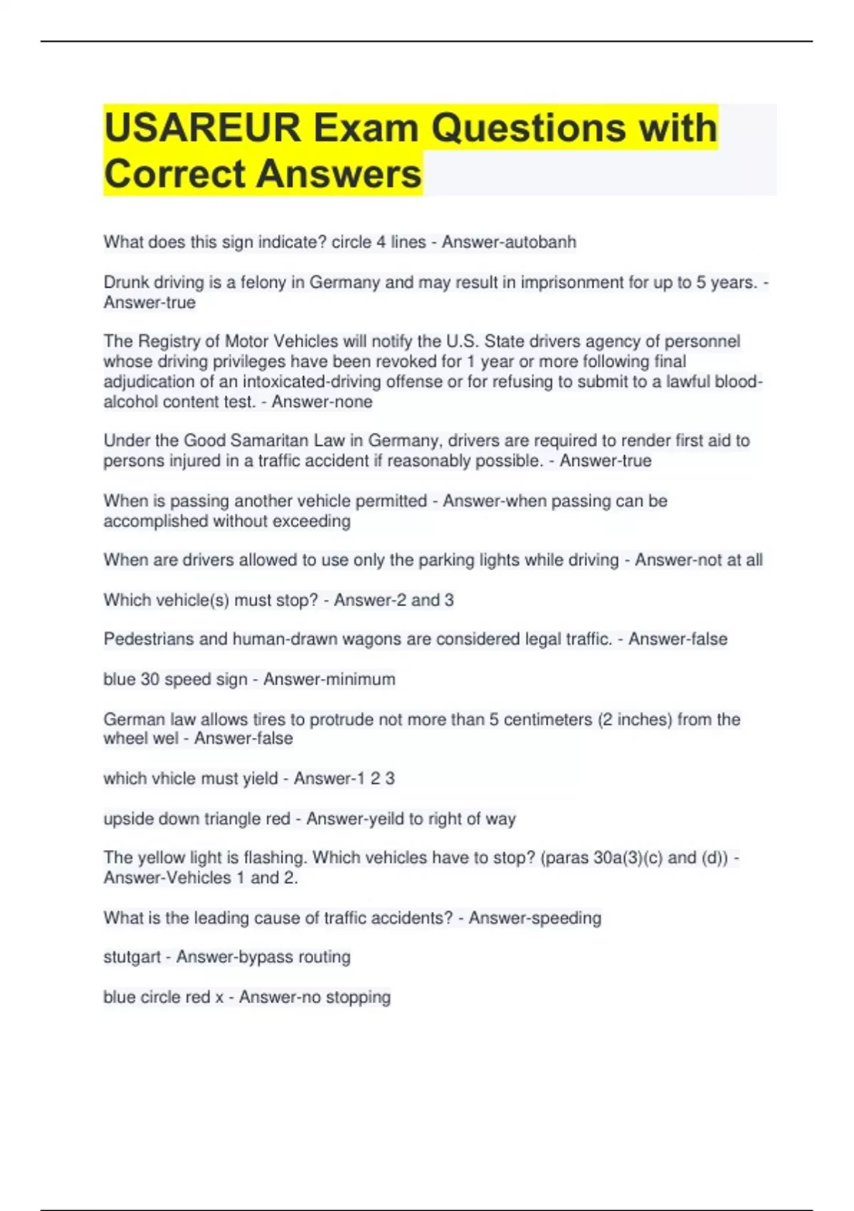 USAREUR Exam Questions with Correct Answers What does this sign indicate? circle 4 lines - Answer-autobanh Drunk driving is a felony in Germany and may result in imprisonment for up to 5 years. - Answer-true The Registry of Motor Vehicles will notify the U.S. State drivers agency of personnel whose driving privileges have been revoked for 1 year or more following final adjudication of an intoxicated-driving offense or for refusing to submit to a lawful blood-alcohol content test. - Answer-none Under the Good Samaritan Law in Germany, drivers are required to render first aid to persons injured in a traffic accident if reasonably possible. - Answer-true When is passing another vehicle permitted - Answer-when passing can be accomplished without exceeding When are drivers allowed to use only the parking lights while driving - Answer-not at all Which vehicle(s) must stop? - Answer-2 and 3 Pedestrians and human-drawn wagons are considered legal traffic. - Answer-false blue 30 speed sign - Answer-minimum German law allows tires to protrude not more than 5 centimeters (2 inches) from the wheel wel - Answer-false which vhicle must yield - Answer-1 2 3 upside down triangle red - Answer-yeild to right of way The yellow light is flashing. Which vehicles have to stop? (paras 30a(3)(c) and (d)) - Answer-Vehicles 1 and 2.