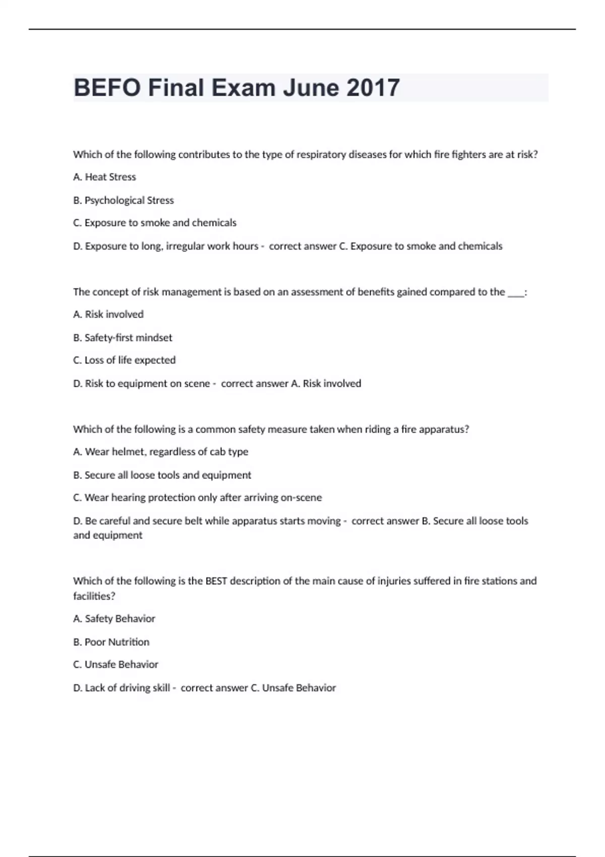 BEFO Final Exam June 2017 Which of the following contributes to the type of respiratory diseases for which fire fighters are at risk? A. Heat Stress B. Psychological Stress C. Exposure to smoke and chemicals D. Exposure to long, irregular work hours - correct answer C. Exposure to smoke and chemicals The concept of risk management is based on an assessment of benefits gained compared to the ___: A. Risk involved B. Safety-first mindset C. Loss of life expected D. Risk to equipment on scene - correct answer A. Risk involved Which of the following is a common safety measure taken when riding a fire apparatus? A. Wear helmet, regardless of cab type B. Secure all loose tools and equipment C. Wear hearing protection only after arriving on-scene D. Be careful and secure belt while apparatus starts moving - correct answer B. Secure all loose tools and equipment Which of the following is the BEST description of the main cause of injuries suffered in fire stations and facilities? A. Safety Behavior B. Poor Nutrition C. Unsafe Behavior D. Lack of driving skill - correct answer C. Unsafe Behavior