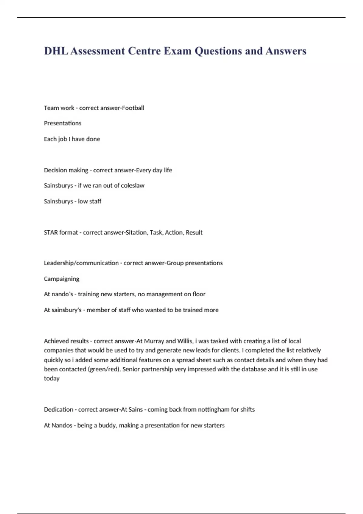 DHL Assessment Centre Exam Questions and Answers