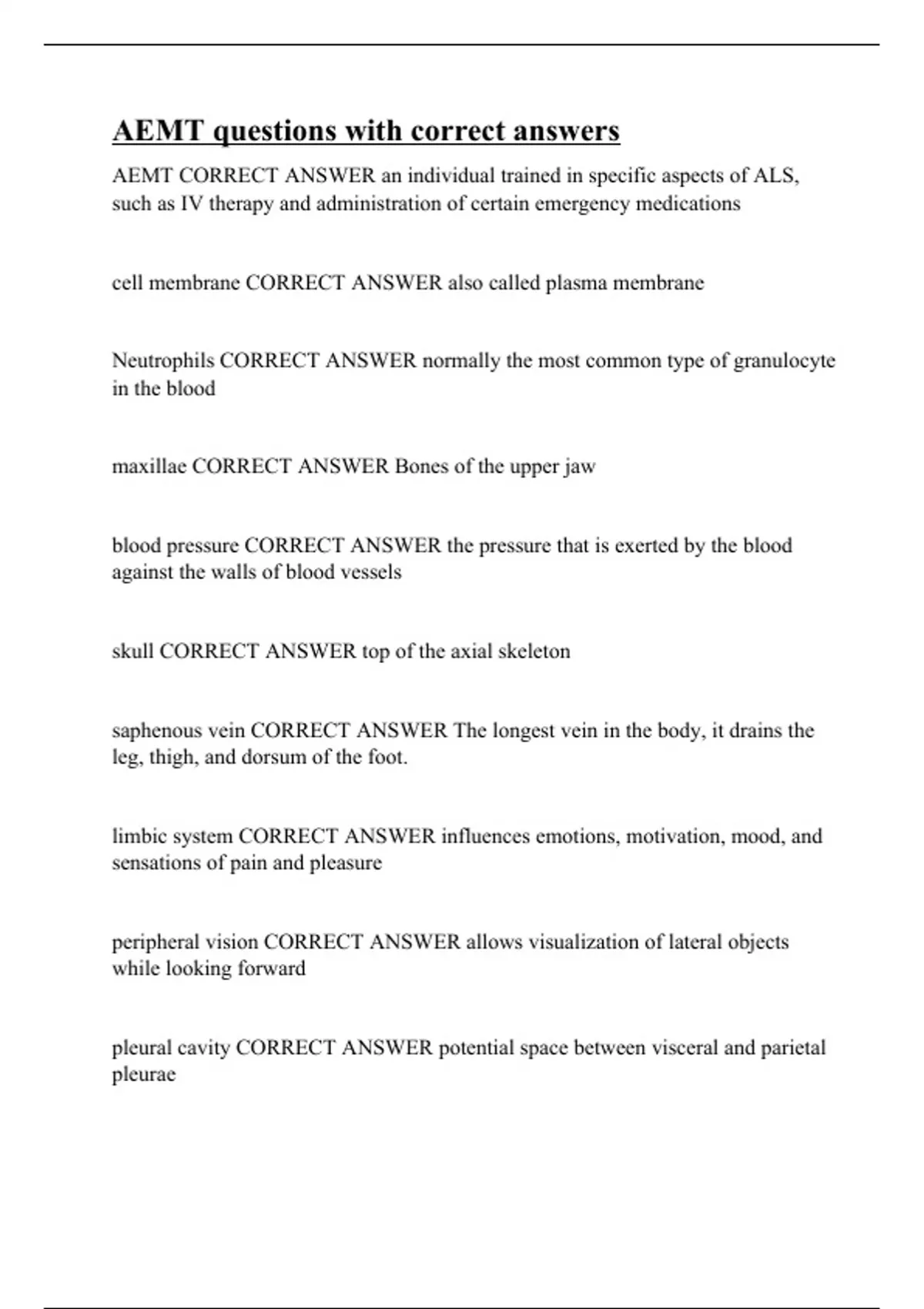 AEMT CORRECT ANSWER an individual trained in specific aspects of ALS, such as IV therapy and administration of certain emergency medications cell membrane CORRECT ANSWER also called plasma membrane Neutrophils CORRECT ANSWER normally the most common type of granulocyte in the blood maxillae CORRECT ANSWER Bones of the upper jaw blood pressure CORRECT ANSWER the pressure that is exerted by the blood against the walls of blood vessels skull CORRECT ANSWER top of the axial skeleton saphenous vein CORRECT ANSWER The longest vein in the body, it drains the leg, thigh, and dorsum of the foot. limbic system CORRECT ANSWER influences emotions, motivation, mood, and sensations of pain and pleasure peripheral vision CORRECT ANSWER allows visualization of lateral objects while looking forward pleural cavity CORRECT ANSWER potential space between visceral and parietal pleurae