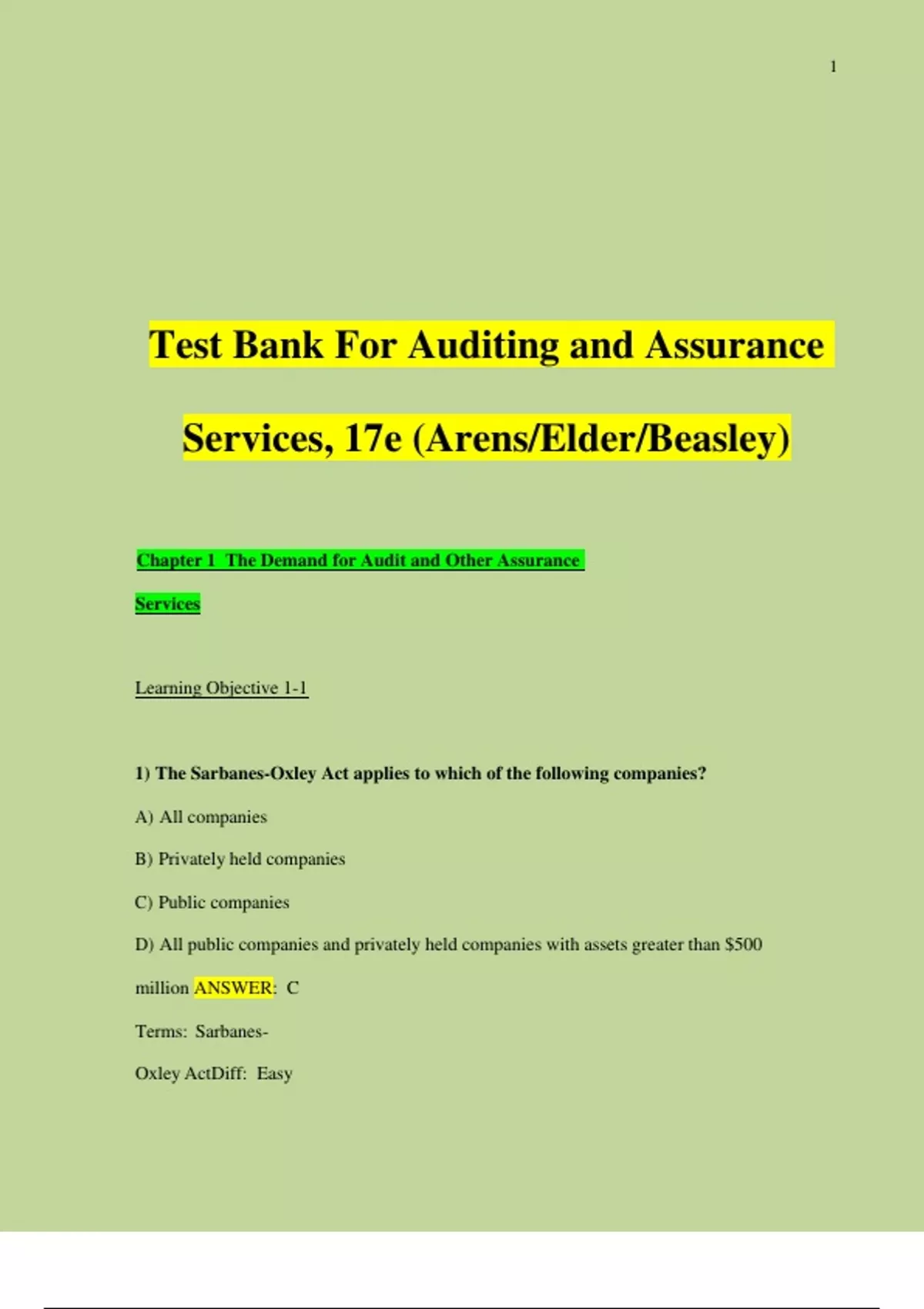 Test Bank For Auditing and Assurance