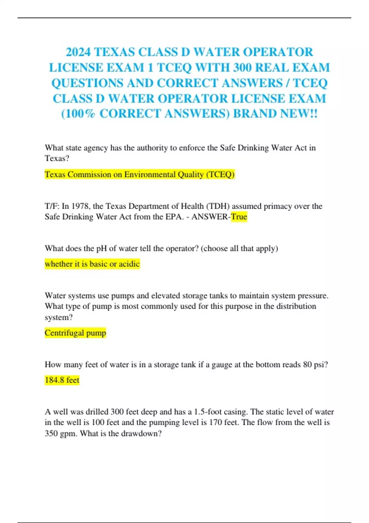 2024 TEXAS CLASS D WATER OPERATOR LICENSE EXAM 1 TCEQ WITH 300 REAL EXAM QUESTIONS AND CORRECT ANSWERS / TCEQ CLASS D WATER OPERATOR LICENSE EXAM (100% CORRECT ANSWERS) BRAND NEW!! What state agency has the authority to enforce the Safe Drinking Water Act in Texas? Texas Commission on Environmental Quality (TCEQ) T/F: In 1978, the Texas Department of Health (TDH) assumed primacy over the Safe Drinking Water Act from the EPA. - ANSWER-True What does the pH of water tell the operator? (choose all that apply) whether it is basic or acidic Water systems use pumps and elevated storage tanks to maintain system pressure. What type of pump is most commonly used for this purpose in the distribution system? Centrifugal pump How many feet of water is in a storage tank if a gauge at the bottom reads 80 psi? 184.8 feet A well was drilled 300 feet deep and has a 1.5-foot casing. The static level of water in the well is 100 feet and the pumping level is 170 feet. The flow from the well is 350 gpm. What is the drawdown?