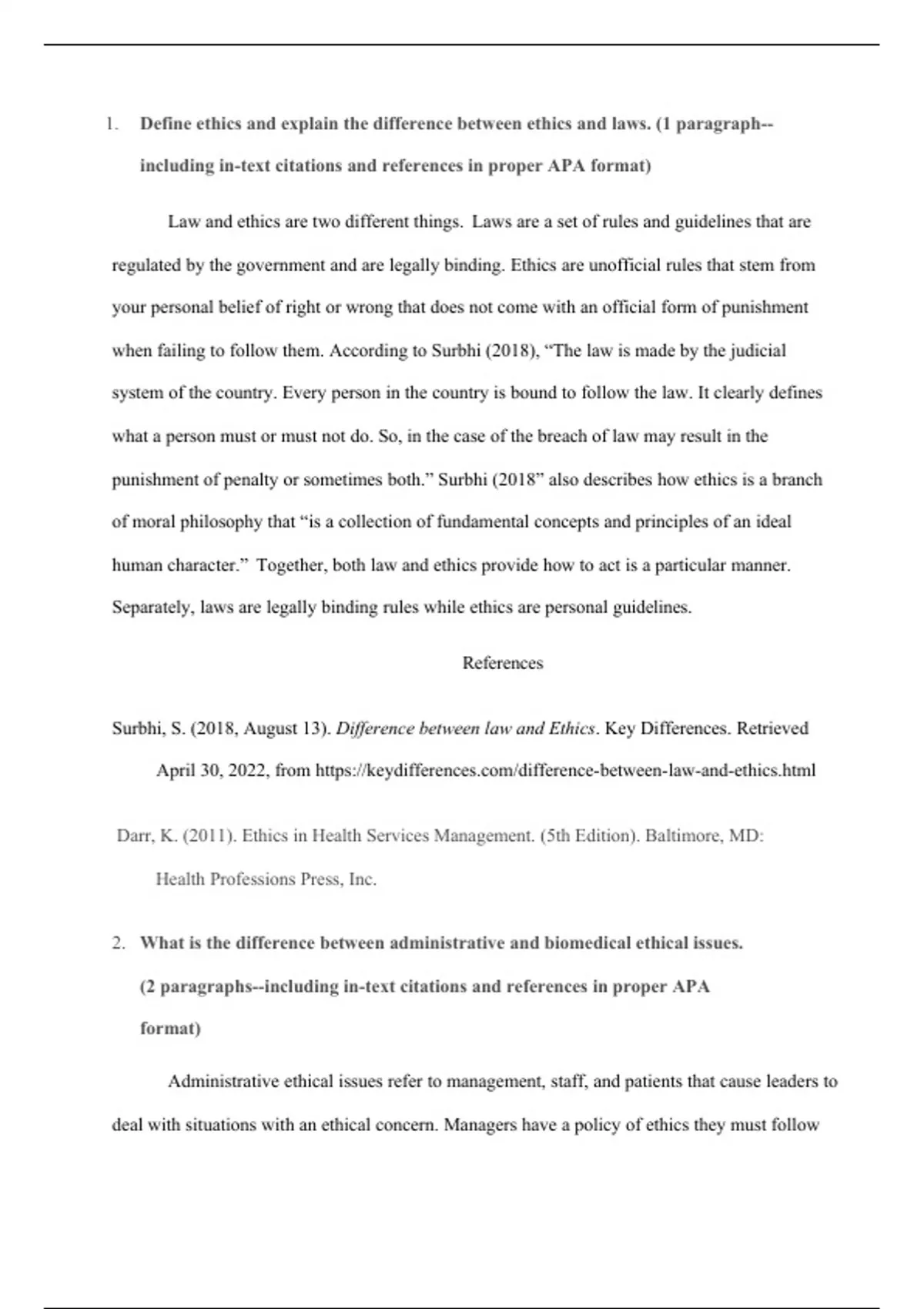 1. Question: Define ethics and explain the difference between ethics and laws. (1 paragraph--including in-text citations and references in proper APA format) 2. Question: What is the difference between administrative and biomedical ethical issues. (2 paragraphs--including in-text citations and references in proper APA format) 3. Question: List the steps to managers' problem solving methodology? (refer to week 1.) (1 paragraph including in-text citations and references in proper APA format) 4. Question: When might an ethics audit be necessary? Briefly describe the three steps associated with it. (1 paragraph including in-text citations and references in proper APA format) 5. Question: The American College of Healthcare Executives (ACHE) is a well-known health services management professional association. According to the ACHE, explain the responsibility/ obligation of a health care executive. (2 paragraphs including in-text citations and references in proper APA format) 6. Question: What is the fiduciary responsibility of health care executives and managers. (2 paragraphs including in-text citations and references in proper APA format) 7. Question: Describe at least three examples of conflicts of interests. Explain how conflicts of interests can present ethical dilemmas for managers/ executives. (3 paragraphs including in-text citations and references in proper APA format) 8. Question: Read the case study below and answer the following questions. (1 1/2 - 2 pages including in-text citations and references in proper APA format). Your answers to each question should be based on your reading of Darr. If necessary, you may refer to the text. Your answers should demonstrate your understanding of the terms as well as your ability to apply them to the case of Baby K (given the limited facts provided.) 1) Discuss what makes this an ethical dilemma. 2)Discuss the implications of this study in terms of the moral principles described in chapter 1. Respect for persons: Did the hospital/ physicians allow the parents to be autonomous in their decision-making? Do you see any elements of paternalism on behalf of the physicians? Beneficence: Did the hospital/ physicians act beneficently? onmaleficence: Did the hospital/ physicians consider nonmaleficence? Justice: Did the hospital act in a just way?