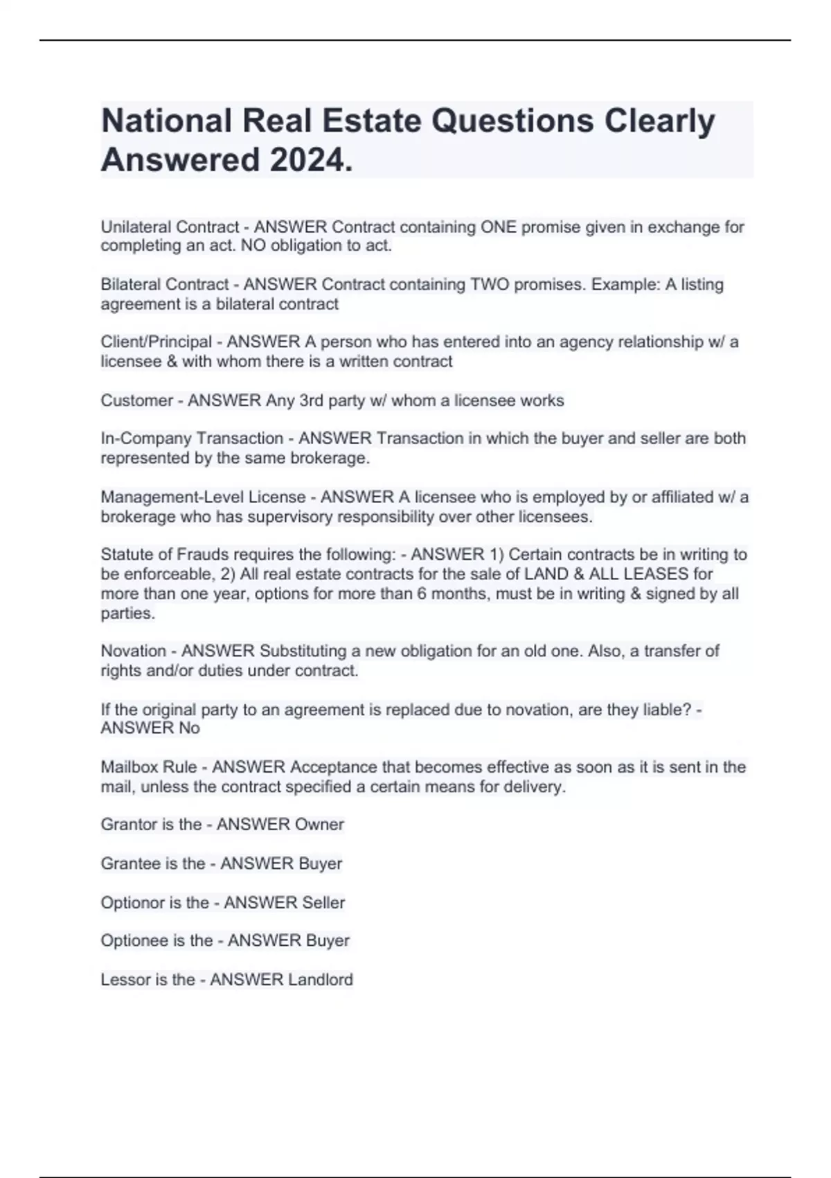 National Real Estate Questions Clearly Answered 2024. Unilateral Contract - ANSWER Contract containing ONE promise given in exchange for completing an act. NO obligation to act. Bilateral Contract - ANSWER Contract containing TWO promises. Example: A listing agreement is a bilateral contract Client/Principal - ANSWER A person who has entered into an agency relationship w/ a licensee & with whom there is a written contract Customer - ANSWER Any 3rd party w/ whom a licensee works In-Company Transaction - ANSWER Transaction in which the buyer and seller are both represented by the same brokerage. Management-Level License - ANSWER A licensee who is employed by or affiliated w/ a brokerage who has supervisory responsibility over other licensees. Statute of Frauds requires the following: - ANSWER 1) Certain contracts be in writing to be enforceable, 2) All real estate contracts for the sale of LAND & ALL LEASES for more than one year, options for more than 6 months, must be in writing & signed by all parties. Novation - ANSWER Substituting a new obligation for an old one. Also, a transfer of rights and/or duties under contract. If the original party to an agreement is replaced due to novation, are they liable? - ANSWER No Mailbox Rule - ANSWER Acceptance that becomes effective as soon as it is sent in the mail, unless the contract specified a certain means for delivery. Grantor is the - ANSWER Owner Grantee is the - ANSWER Buyer Optionor is the - ANSWER Seller Optionee is the - ANSWER Buyer Lessor is the - ANSWER Landlord