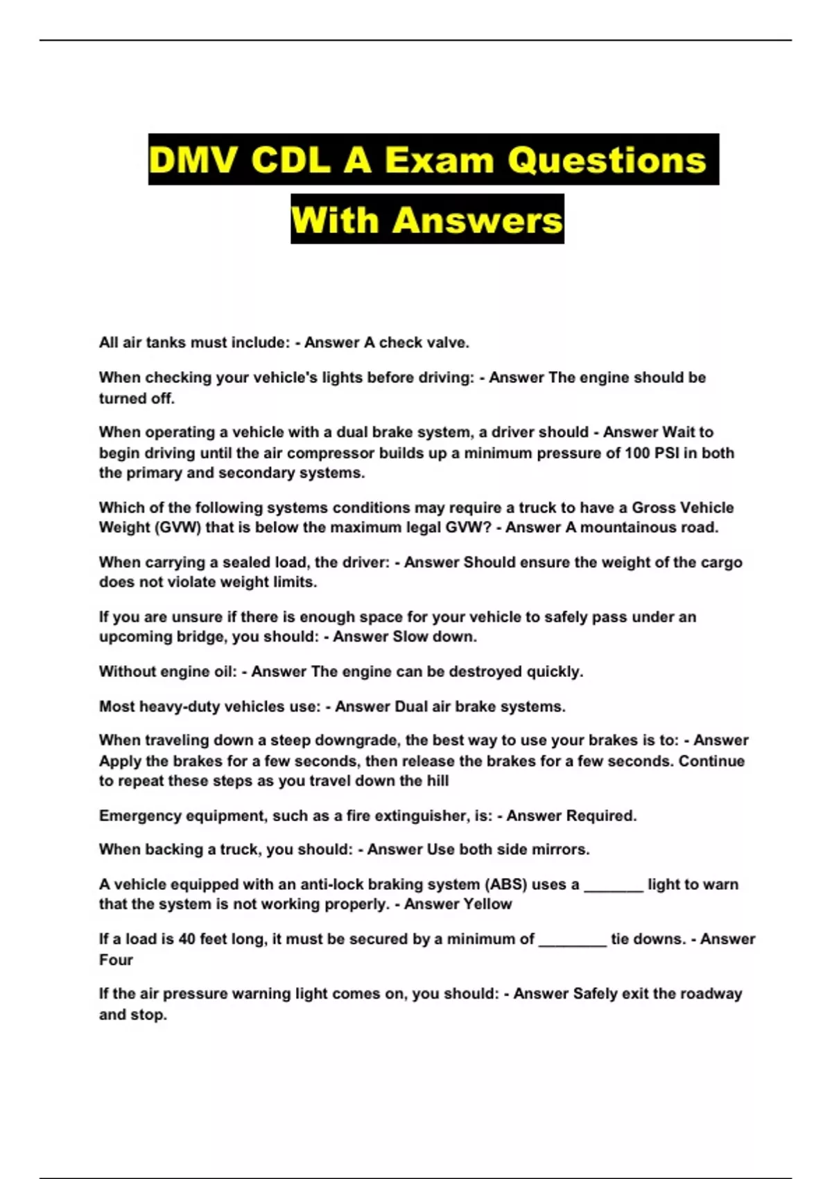 DMV CDL A Exam Questions With Answers...